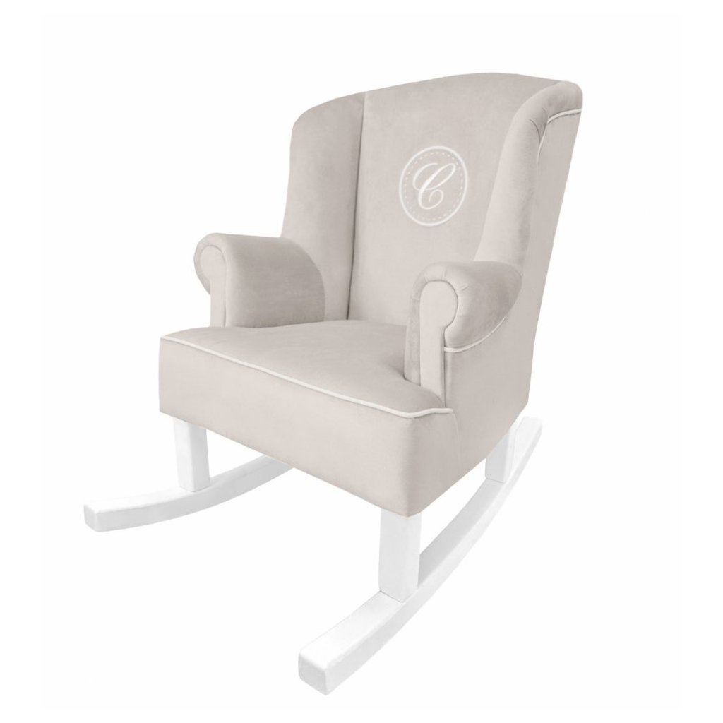 Elegantné štylizované mini hojdacie kreslo potiahnuté kvalitnou umývateľnou textíliou v nadčasovej farbe slonovej kosti. Zdobené exkluzívnym písmenom "C". Krásny klasický nábytok, ktorý obohatí každú detskú izbičku.