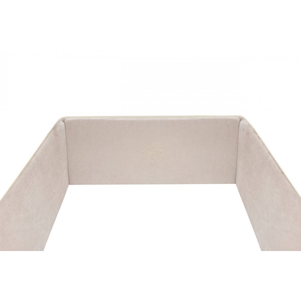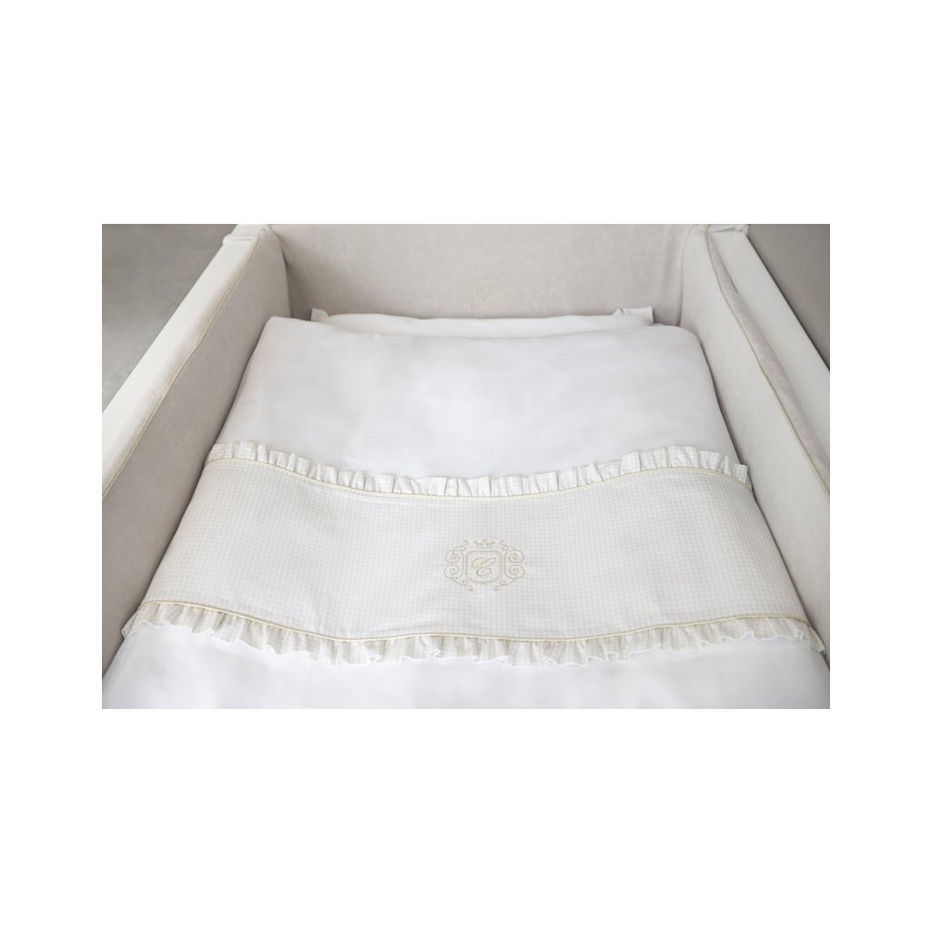 Mantinel do postieľky Golden Sand je vyrobený z vysokokvalitnej zamatovej tkaniny a ozdobený elegantným zlatým znakom.