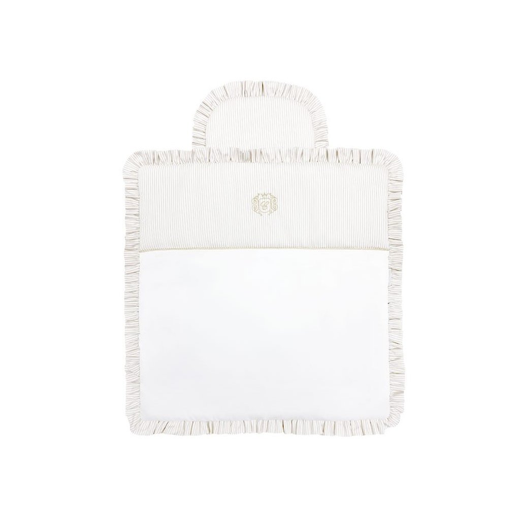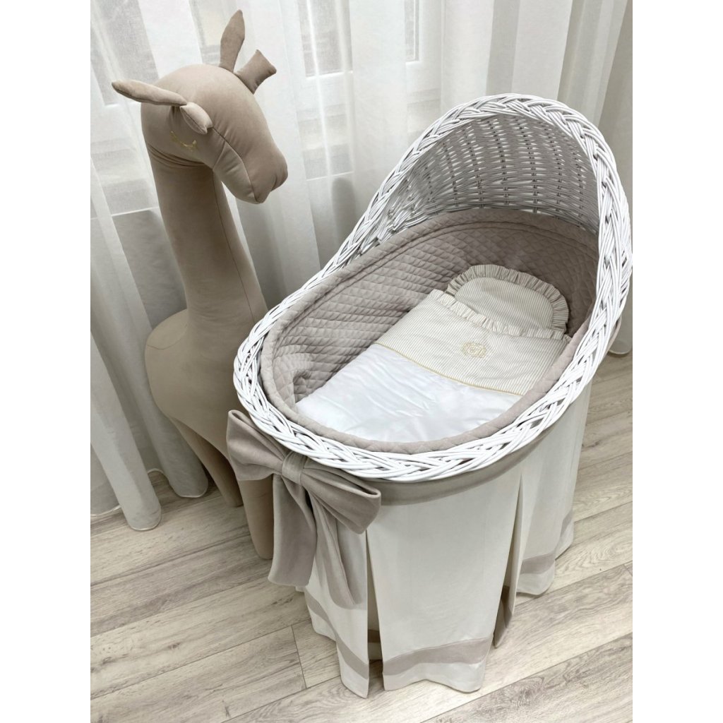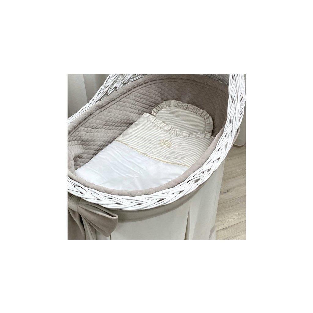 Saténová posteľná bielizeň do Mojžišovho košíka. Ideálne aj pre kočík, kolísku a prútený kočík. Vyrobené z bielej jemnej saténovej bavlny s panelom a vankúšom v bielo-béžových pruhoch. Zdobené zlatým znakom a zakončené krásnym volánom. Obliečka má výplň.