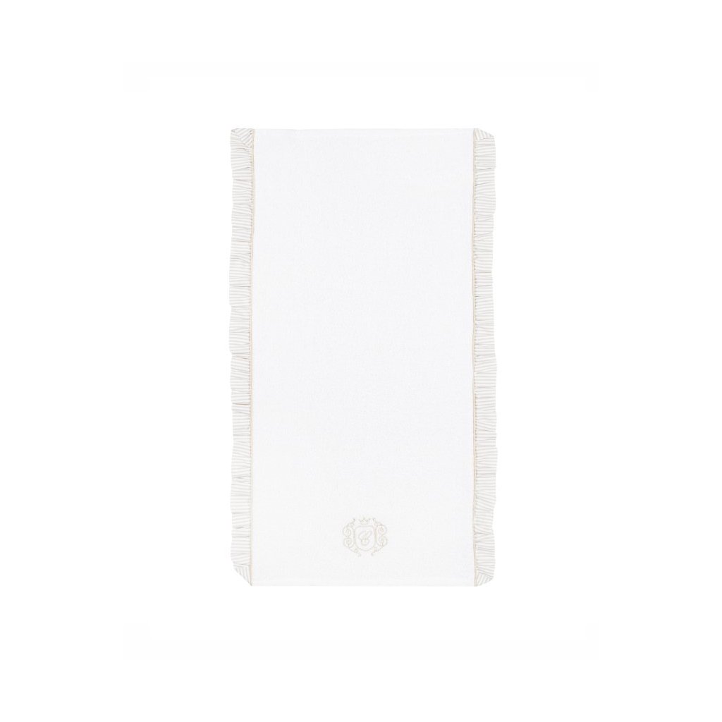 Náhradný poťah na prekrytie prebaľovacej podložky. Vyrobený z bielej froté bavlny so zlatým znakom, rozkošným riasením v béžovej farbe so zlatým lemom.