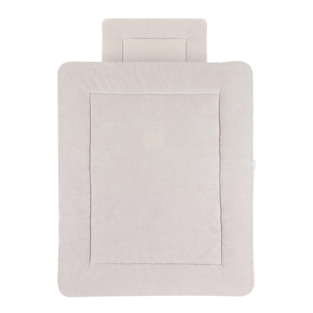 Prvé obliečky pre malé bábätko, už s výplňou. Sada obsahuje paplón a vankúšik s výplňou. Je ozdobená elegantným znakom.