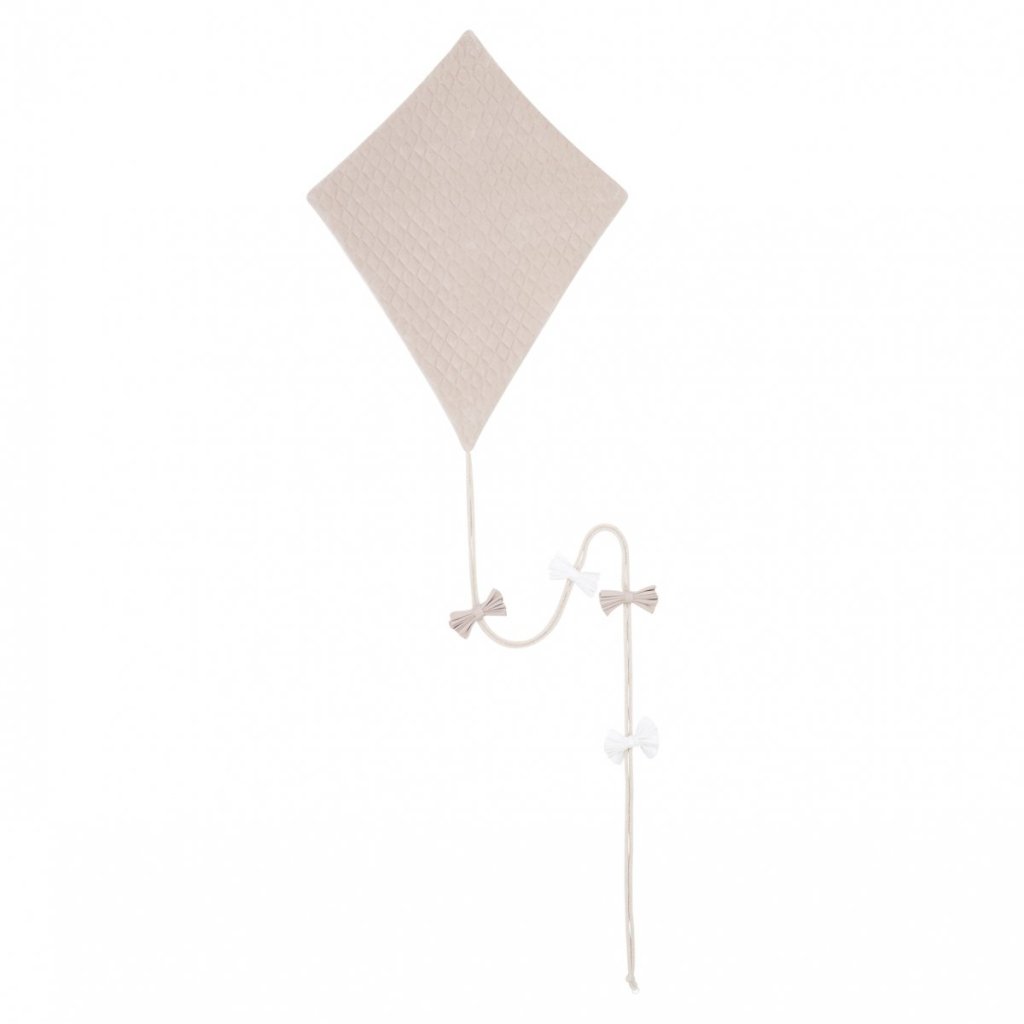 Krásny ručne vyrobený šarkan vyrobený z kvalitného prešívaného béžového velúru. Jeho špagát je ozdobený rozkošnými mašličkami v béžovej a bielej farbe. Šarkan je originálna dekorácia do detskej izbičky.