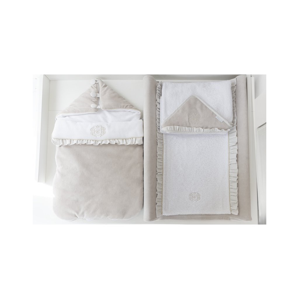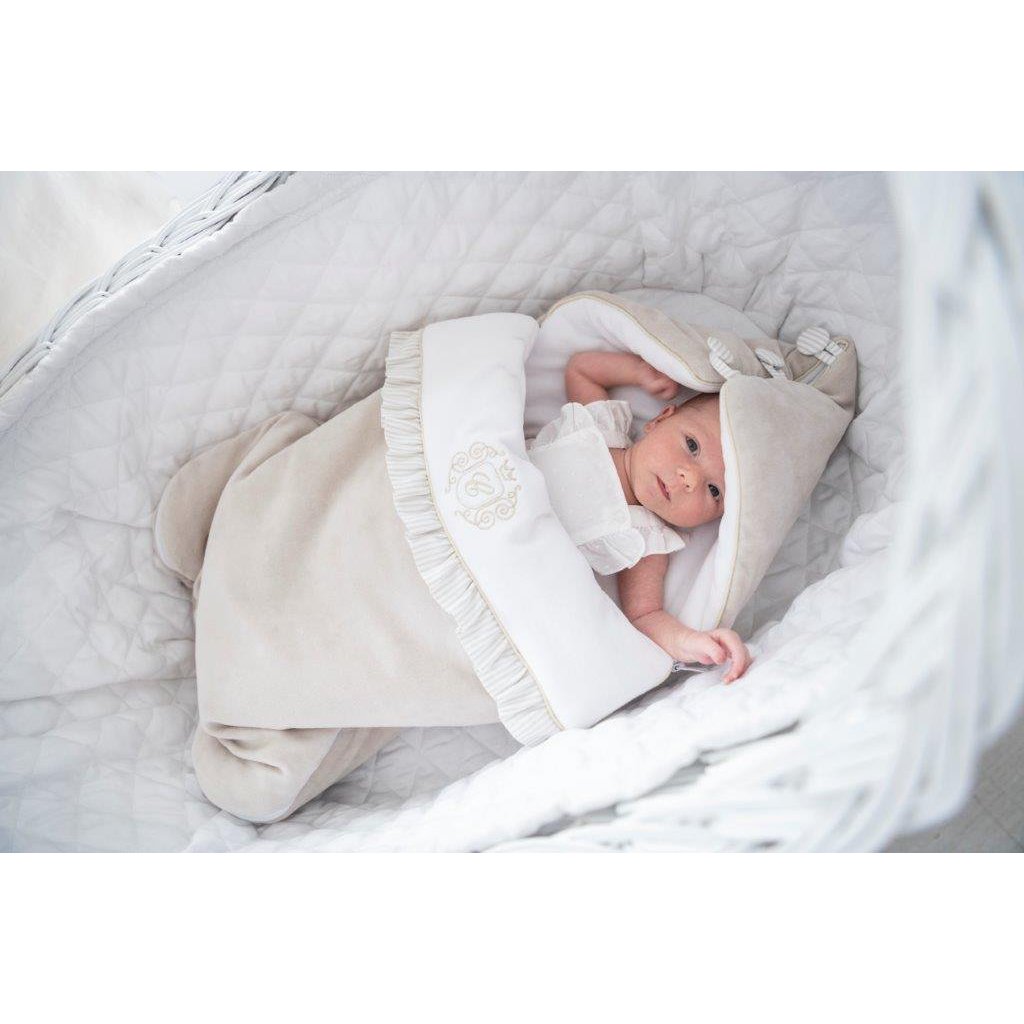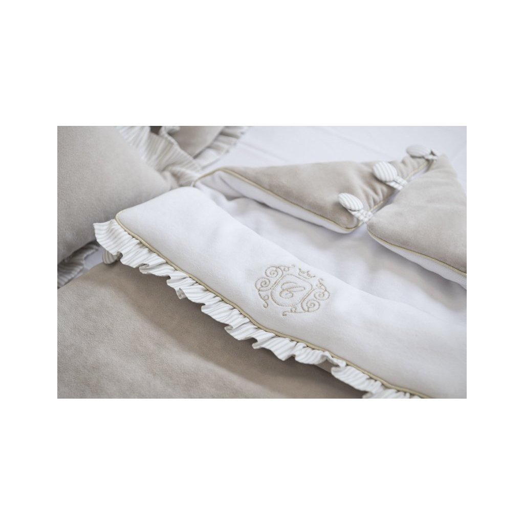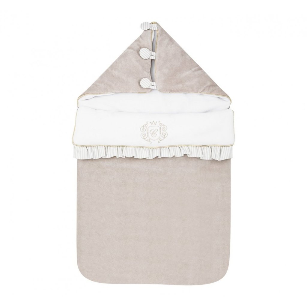 Elegantná perinka vyrobená z mäkkého béžového zamatu. Vnútorná časť je z bieleho velúru a je zdobená elegantným zlatým znakom. Táto perinka má kapucňu na gombíky a po rozložení môže ísť o deku alebo podložku. V zadnej časti perinky sú špeciálne otvory, ktoré vám umožňujú perinku používať v autosedačke.