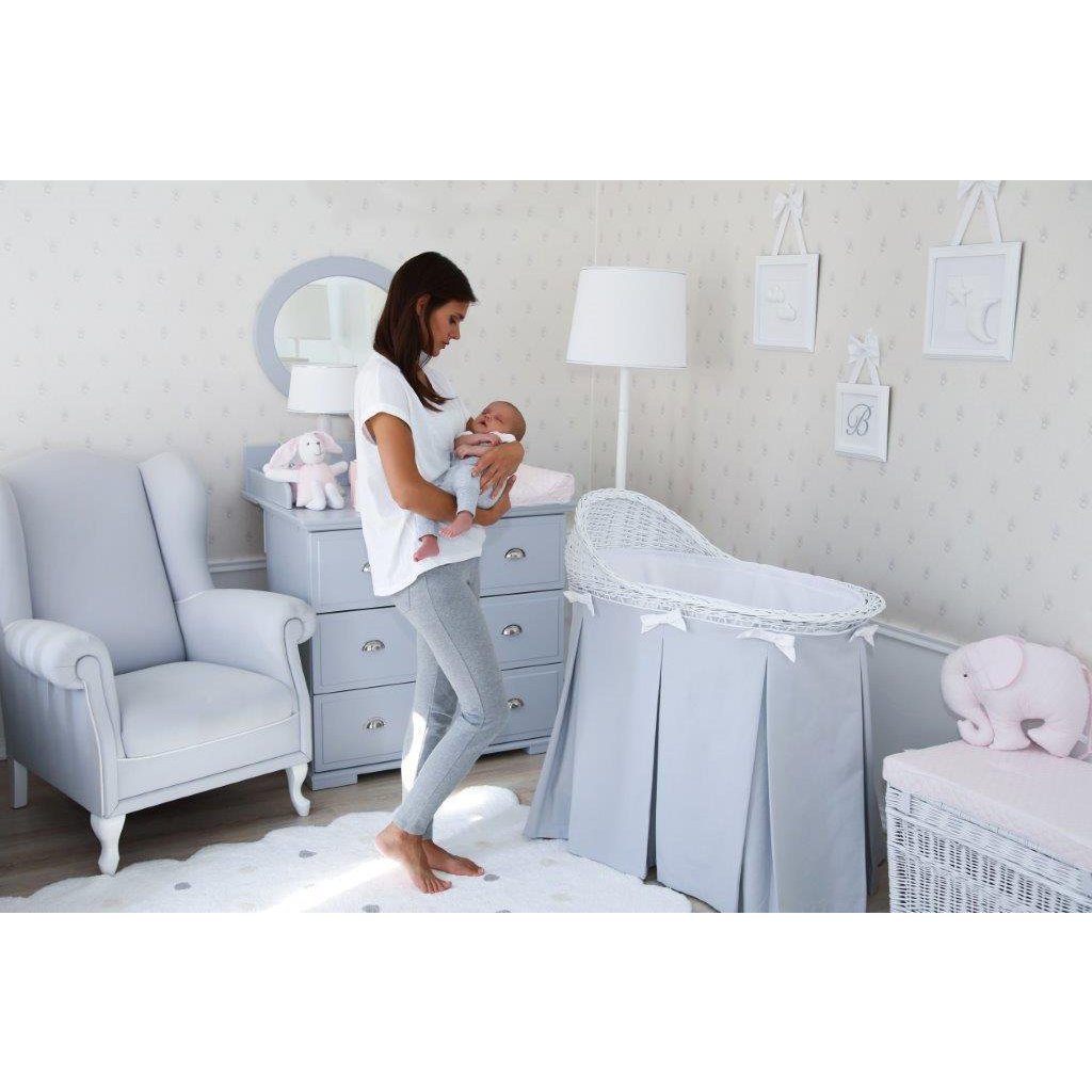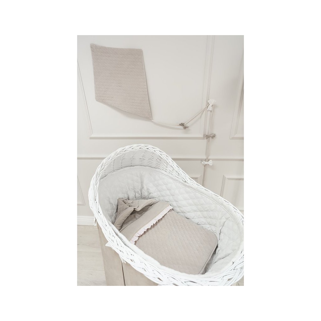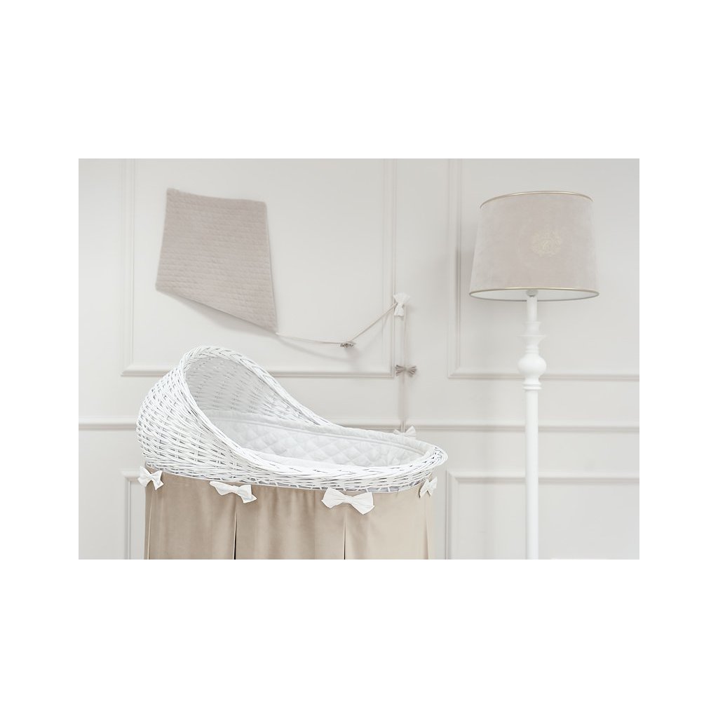 Veľmi okúzľujúci košík pre novorodenca, vyrobený z prírodného ručne tkaného prútia v bielej farbe. Košík je na kolieskach, vďaka čomu môžete košík jednoducho presúvať.