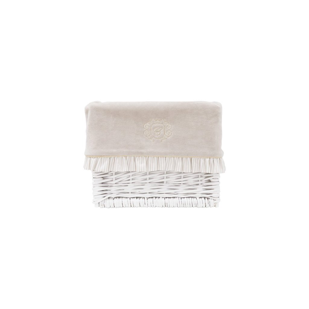 Elegantný prútený košík s béžovým velúrovým poťahom, zdobený elegantnou zlatou výšivkou a očarujúcim volánom. Ideálne miesto na uloženie hračiek, plienok alebo iných doplnkov pre deti.