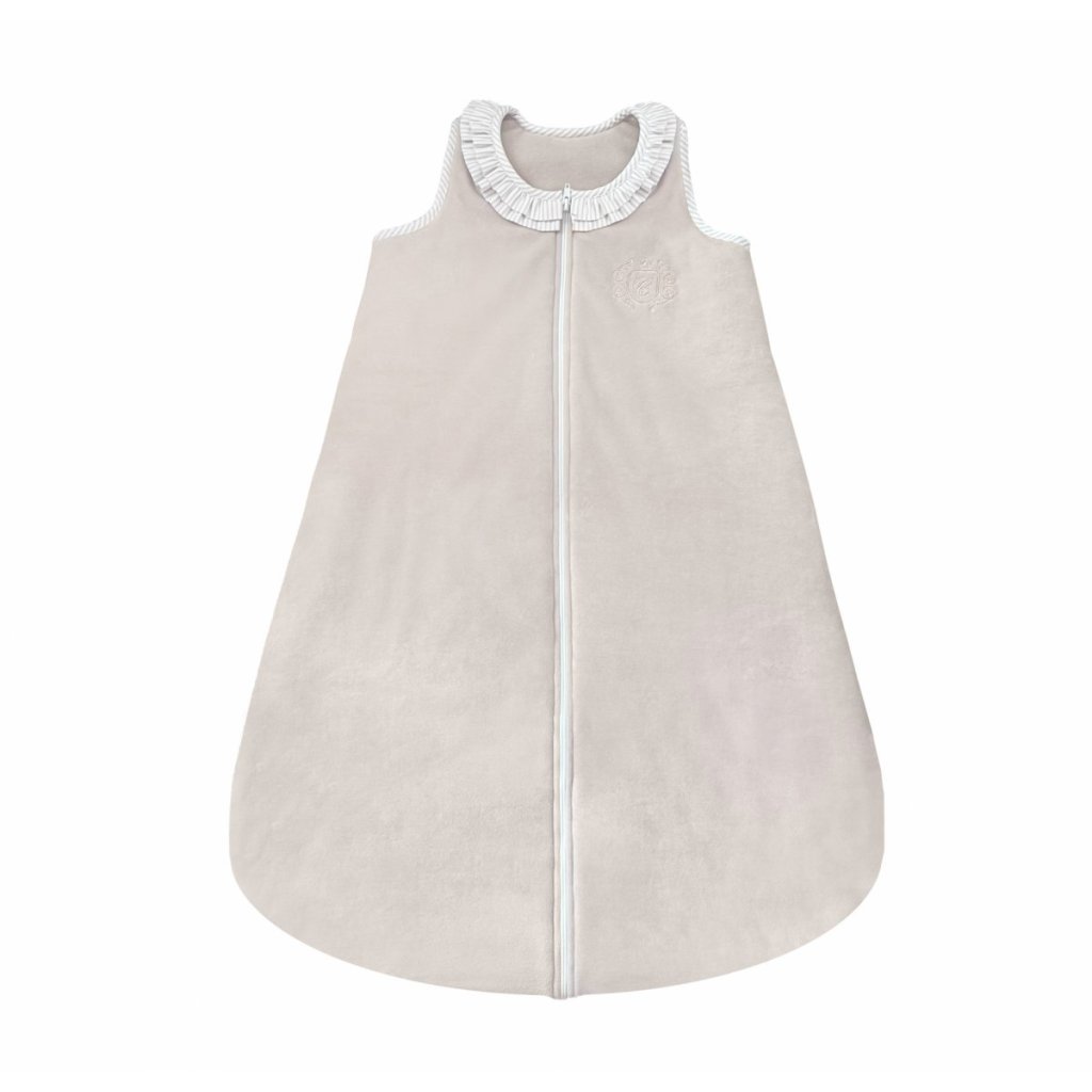Teplý spací vak vyrobený z mäkkého béžového velúru. Zdobený očarujúcim bielym golierom a elegantným emblémom. Veľmi pohodlné použitie - vpredu je dlhý zips.