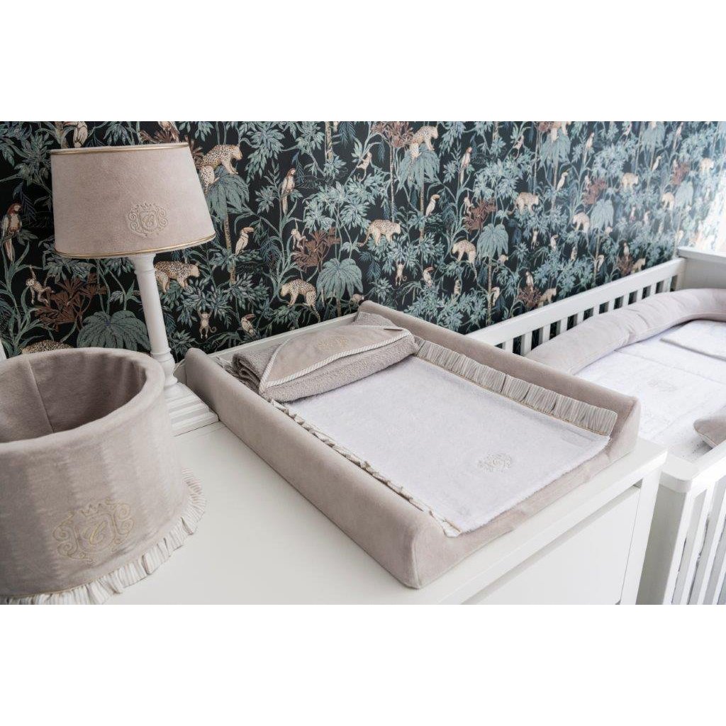 Krásna lampa s béžovým velúrovým tienidlom. Zdobené elegantným, zlatým firemným znakom a ozdobnou páskou. Táto lampa sa hodí do každej detskej izby - ako nočná lampa, na komodu alebo okno.