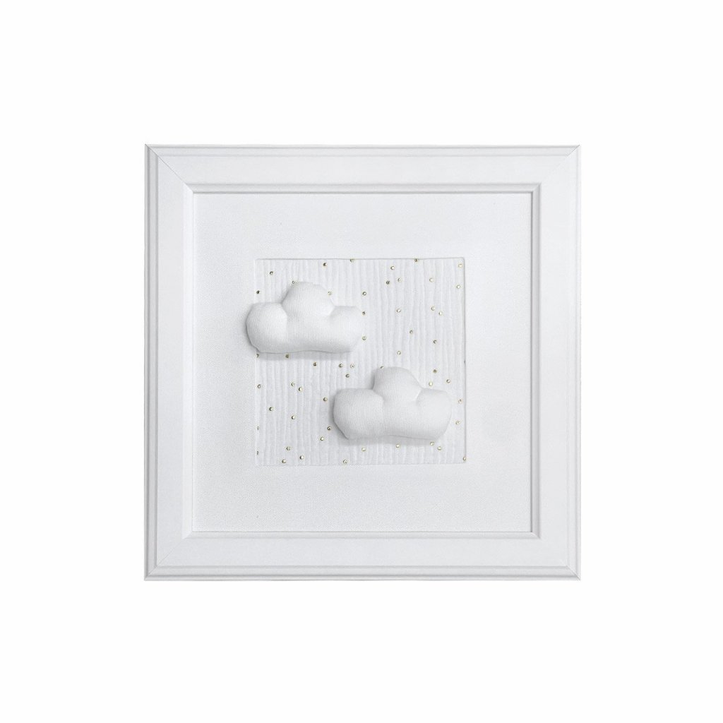 Obrazy pre deti vytvoria rozprávkovú detskú izbu. Zhmotnite ich detské sny do reálnej podoby! Krásny biely obrázok s obláčikmi. Vnútorná časť obrazu je vyrobená z mäkkého textilu. Trojrozmerné obláčiky sú vyrobené z bielej bavlny. Pozadie je vyrobené z trblietavého zlatého bodkovaného textilu. Krásna dekorácia do detskej izby.