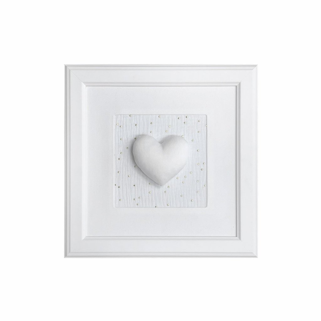 Obrazy pre deti vytvoria rozprávkovú detskú izbu. Zhmotnite ich detské sny do reálnej podoby! Krásny biely obrázok so srdiečkom. Vnútorná časť obrazu je vyrobená z mäkkého textilu. Trojrozmerné srdce je vyrobené z bielej bavlny. Pozadie je vyrobené z trblietavého zlatého bodkovaného textilu. Krásna dekorácia do detskej izby.