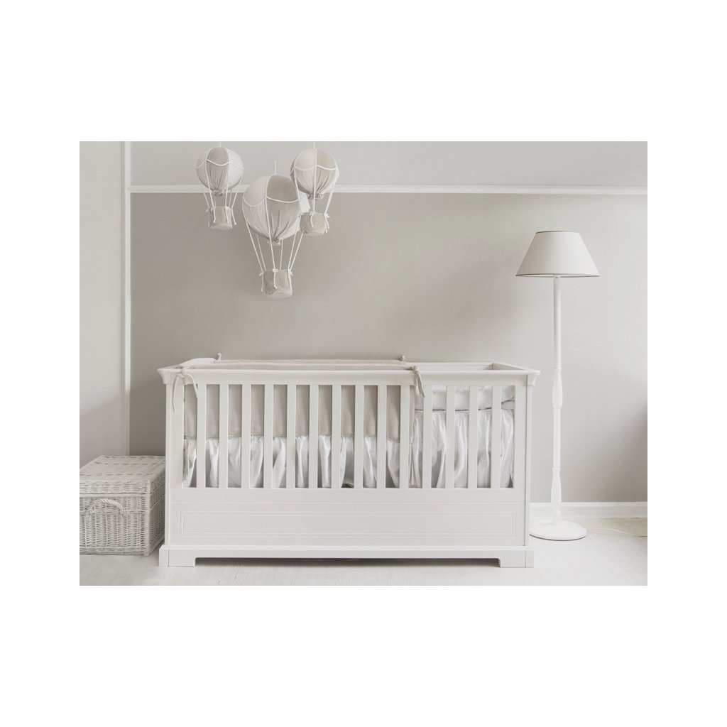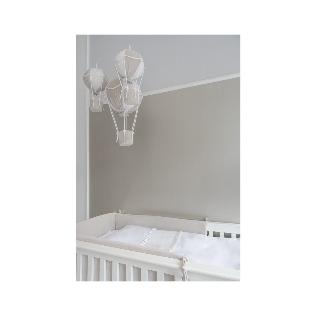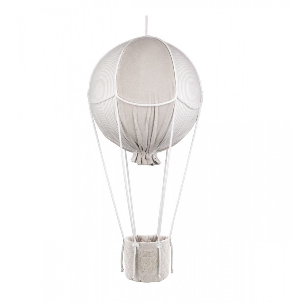 Dekoratívny balónik v béžovej farbe. Košík je vyrobený z béžovej prešívanej látky a ozdobený elegantným zlatým znakom. Balón je vyrobený z kombinácie látky s bielymi a béžovými pruhmi a béžovým zamatom. Balón má šnúru, pomocou ktorej sa dá ľahko namontovať na strop.