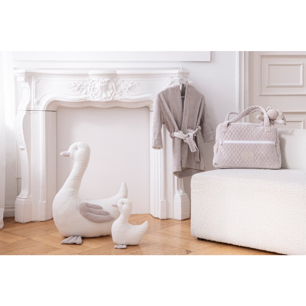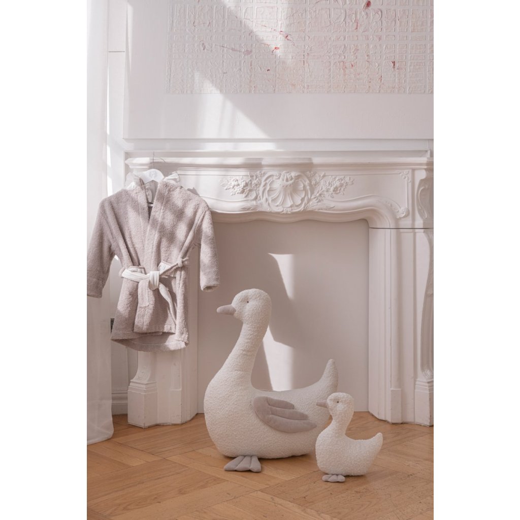 Rozkošná, ručne vyrobená húska z husacej látky boucle. Bude to najlepší kamarát vášho dieťatka a krásna dekorácia do vašej domácnosti. Húska je dostupná vo veľkosti XL a aj v menšej veľkosti.