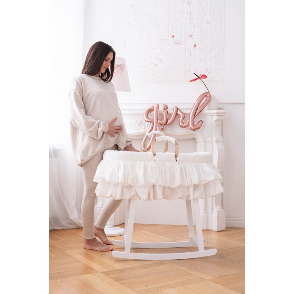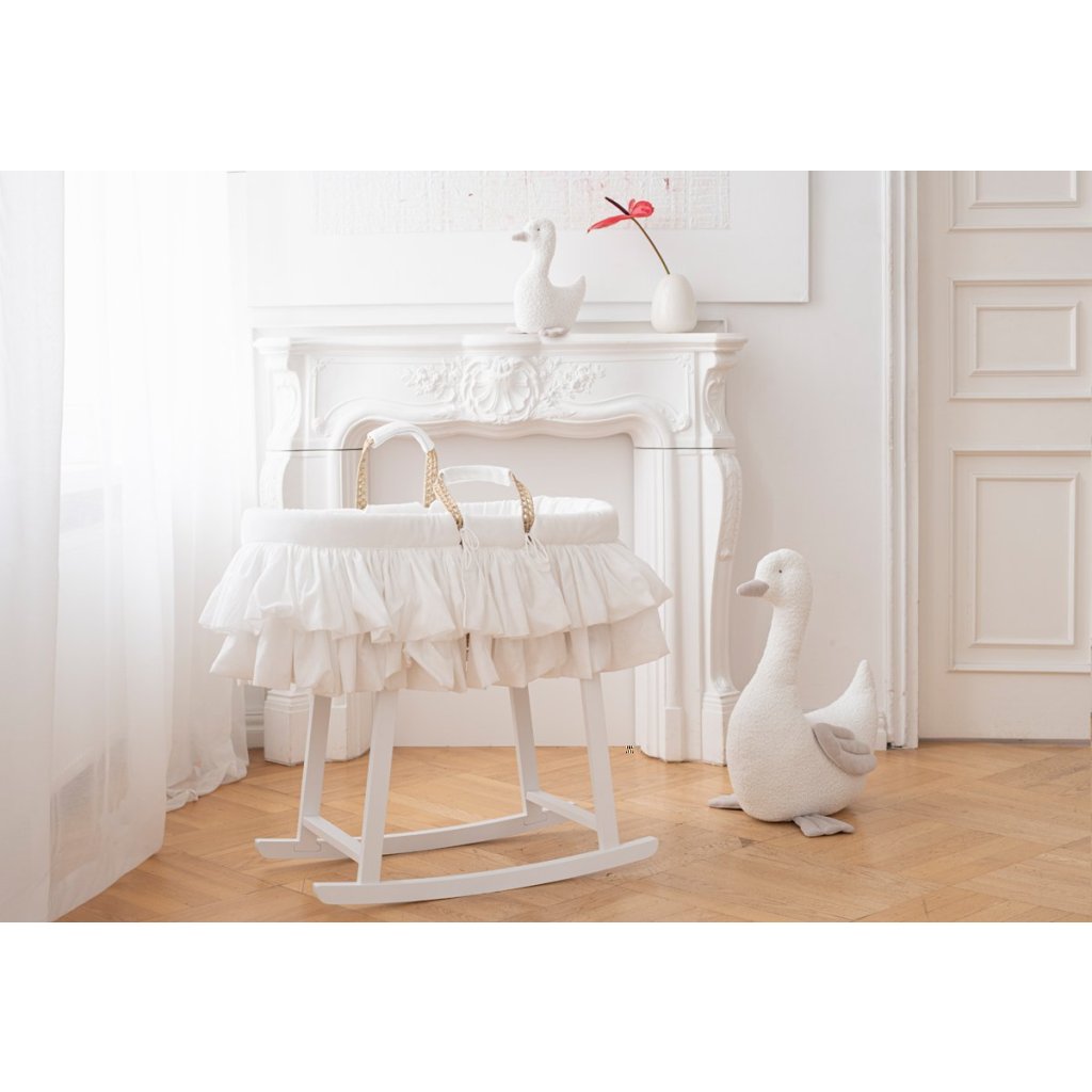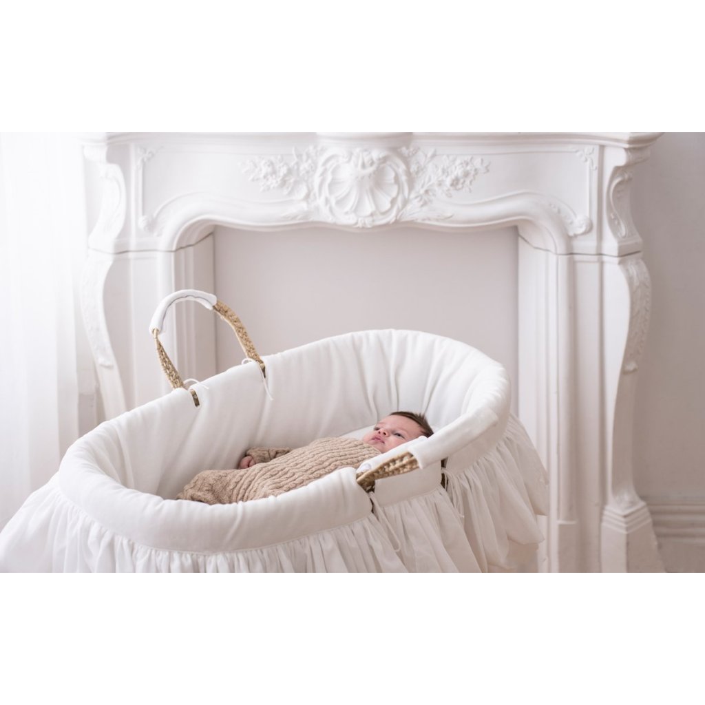 Rozkošný kôš Mojžiš vyrobený z palmových listov bezpečný pre dieťa. Má prešívanú bavlnenú textilnú podšívku v slonovinovej farbe (zaväzuje sa malými ramienkami), v spodnej časti má oválny piškótový matrac.