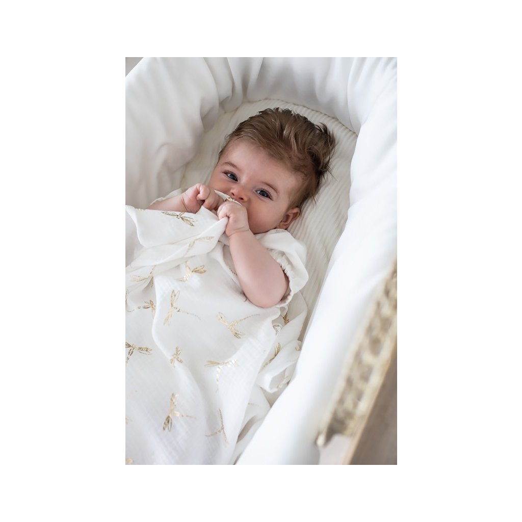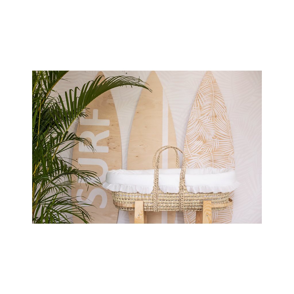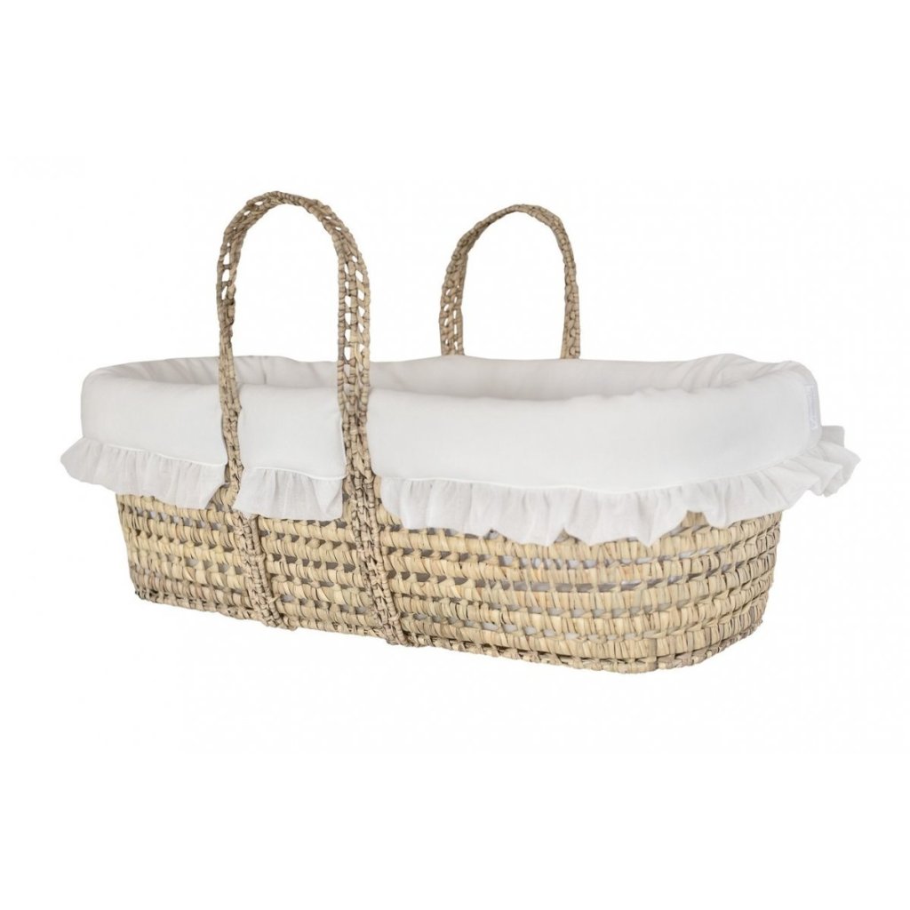 Rozkošný kôš Mojžiš vyrobený z palmových listov bezpečný pre dieťa. Má prešívanú bavlnenú textilnú podšívku v slonovinovej farbe (zaväzuje sa malými ramienkami) a v spodnej časti má oválny piškótový matrac.