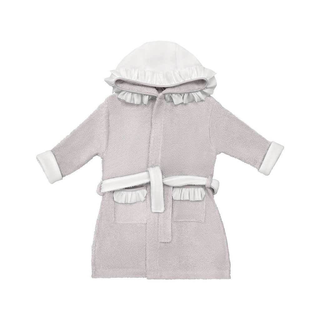 Dievčenský župan z exkluzívnej kolekcie Ivory Mist. Je starostlivo vyrobený, obšitý béžovou froté látkou a velúrovými vložkami zo slonoviny. Kapucňa a vrecká sú zakončené priehľadným voálovým volánom. Ideálne ako darček.