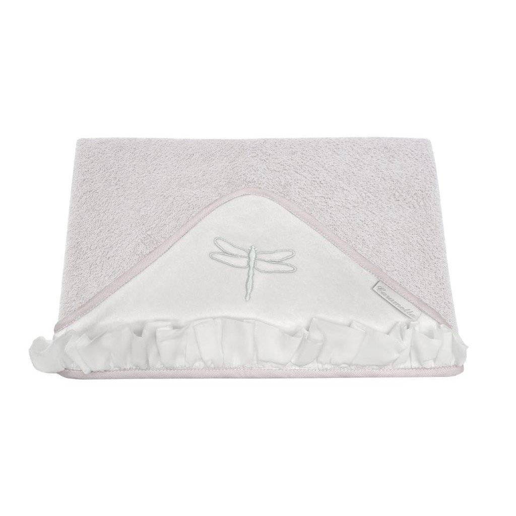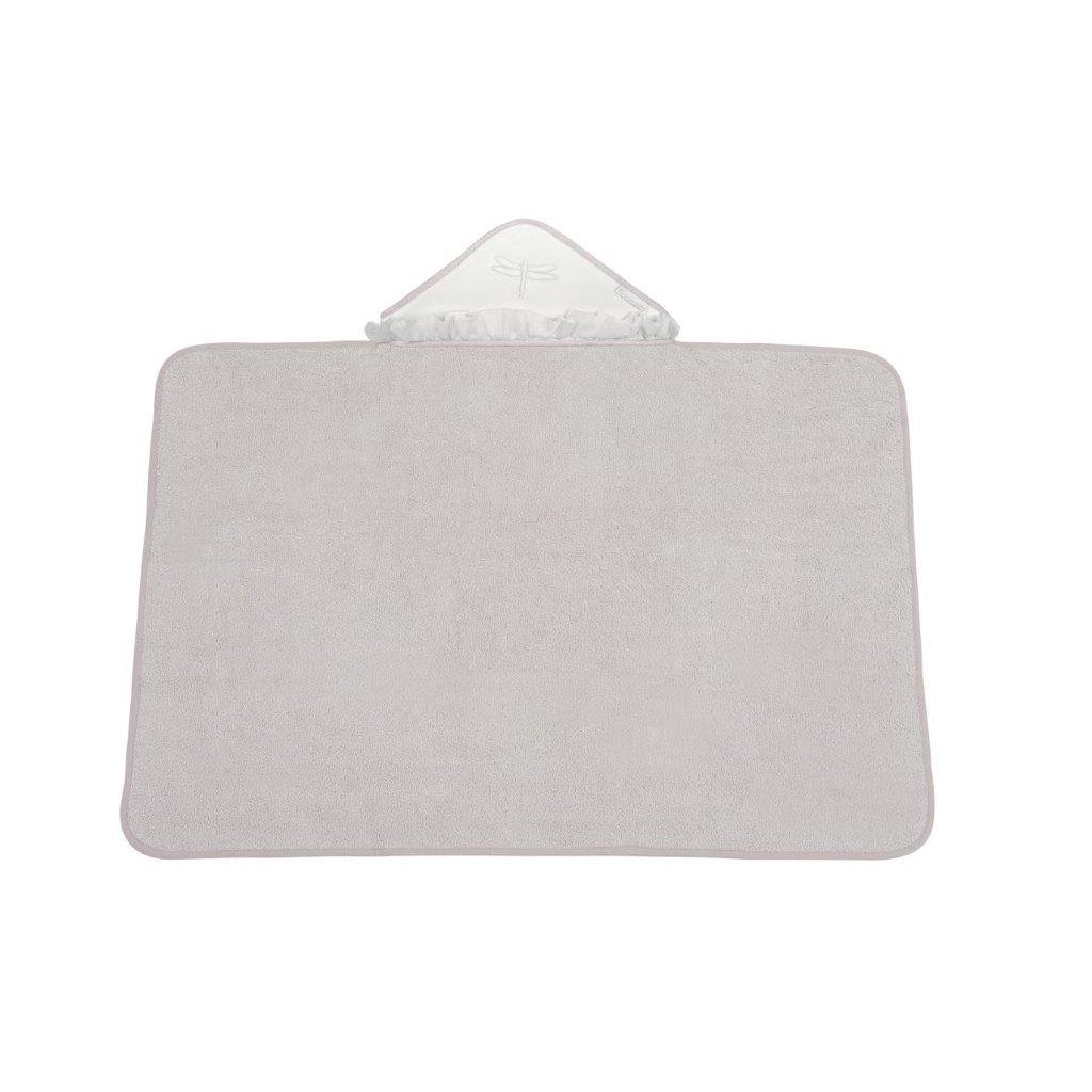 Elegantná osuška vyrobená z béžovej froté látky. Čiapka z jemného zamatu slonovej kosti je zdobená priehľadným voálovým volánom a výšivkou.