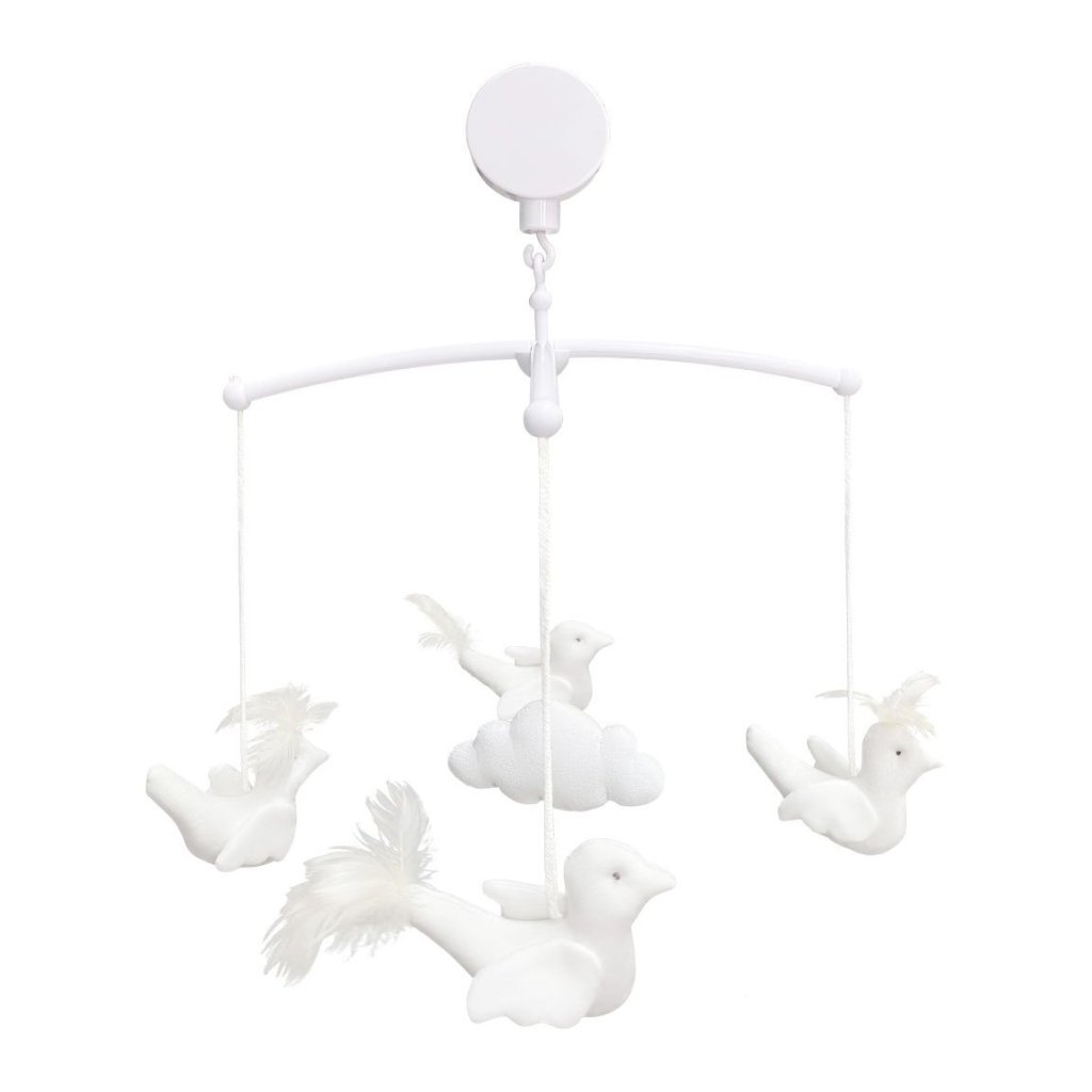 Kolotoč do postieľky s krásnymi slonovinovými vtáčikmi. Kolotoč hrá relaxačnú melódiu.