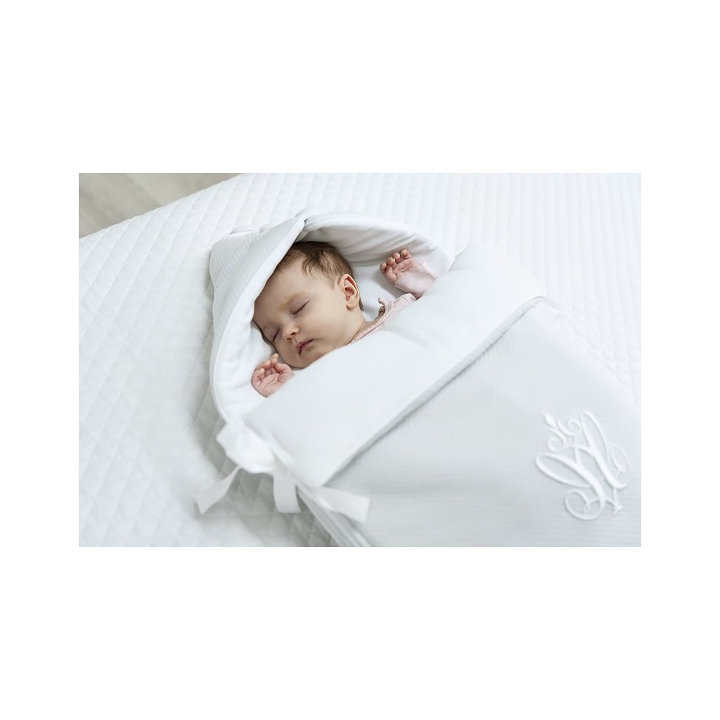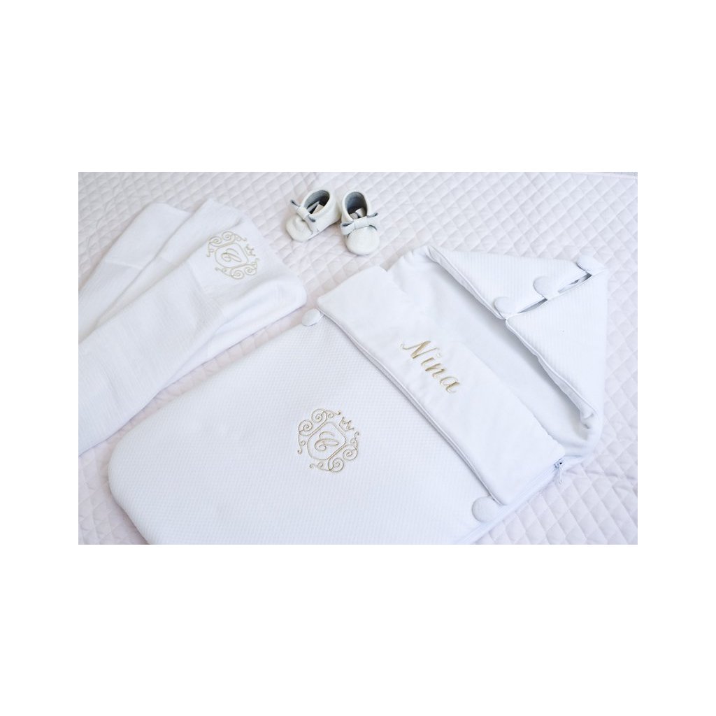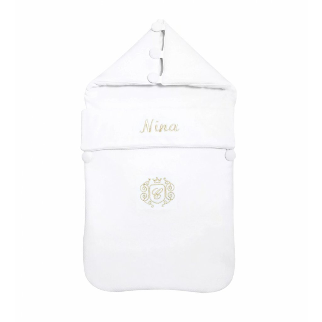 Elegantná perinka vyrobená z jemného bieleho teplého velúru a jemne štruktúrovaného materiálu. Zdobená elegantným zlatým znakom a menom dieťaťa. Má vnútorný zips. Je to ideálny nápad na darček - perinka je zabalená v elegantnej krabičke. Meno dieťatka je potrebné uviesť do poznámky pri vytváraní objednávky.