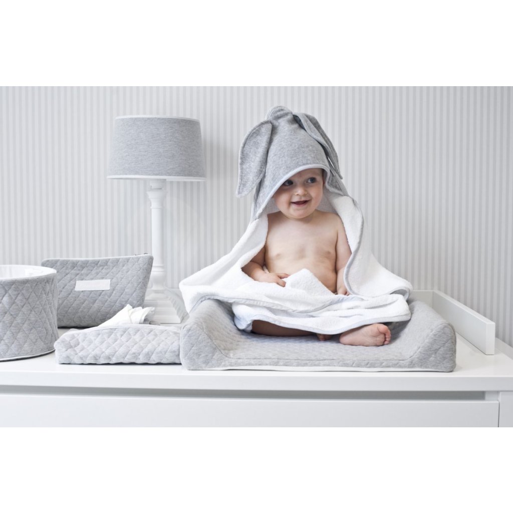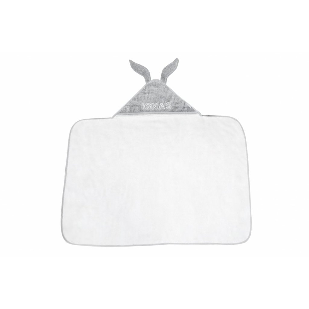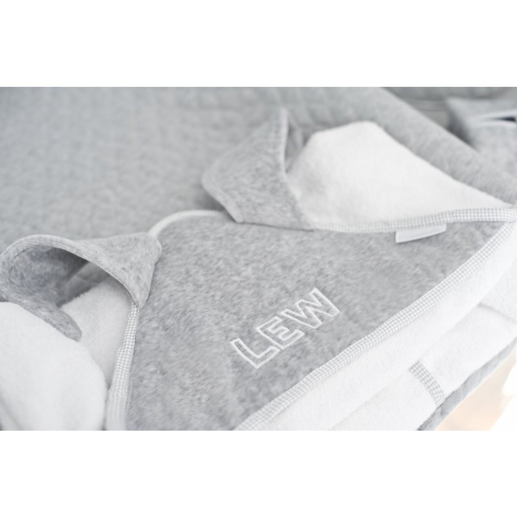 Elegantná osuška vyrobená z bielej froté látky s bledošedou kapucňou. Vhodná pre menšie aj väčšie detičky, nakoľko má väčší rozmer ako bežné osušky. Ideálna ako darček- je zabalená v krásnej krabičke. Možnosť vyšiť meno dieťatka - meno uveďte do poznámky pri vytváraní objednávky.