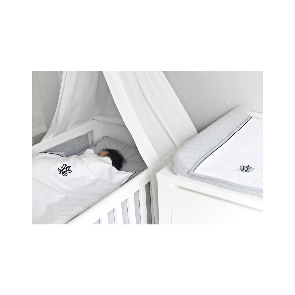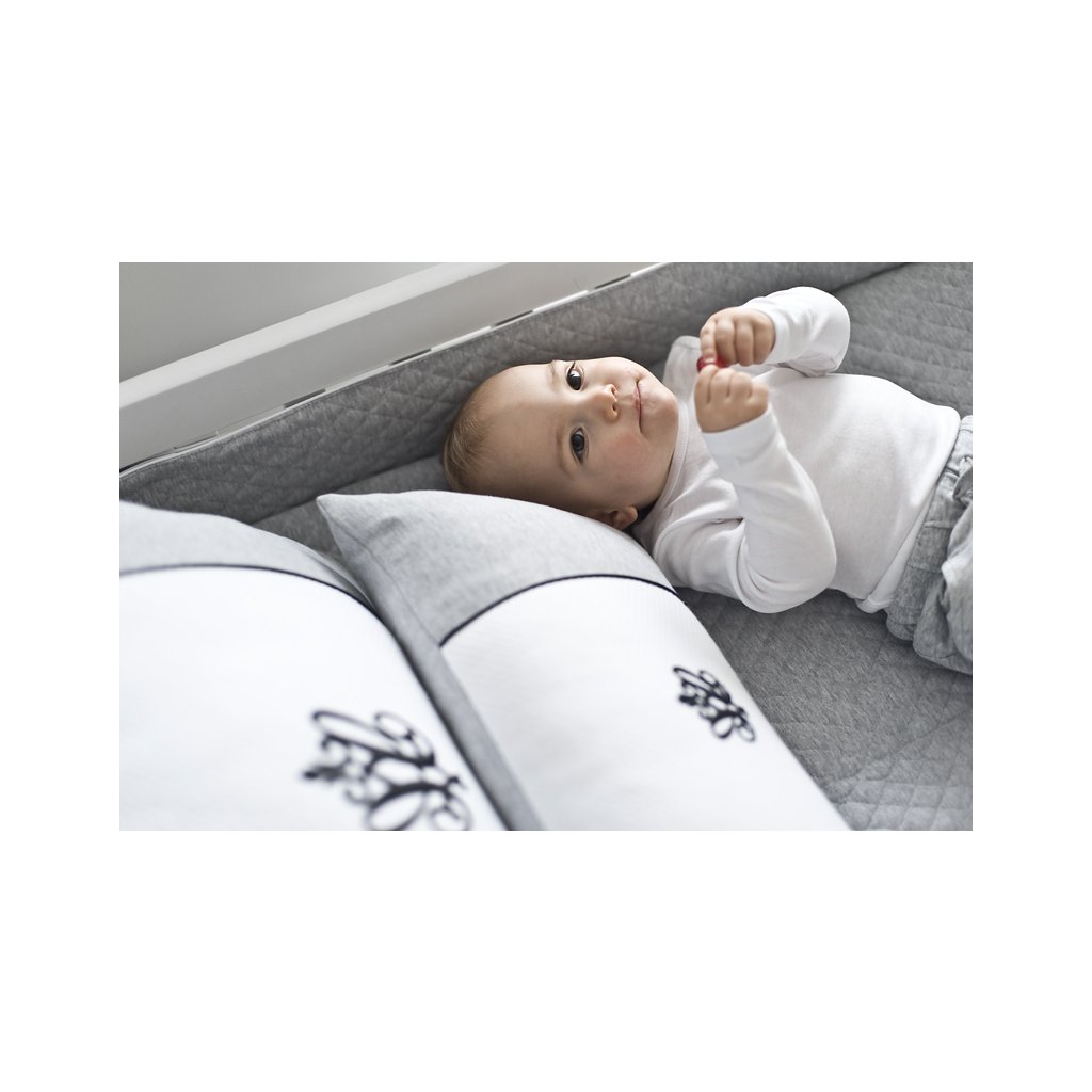 Elegantný ochranný mantinel do postieľky je vyrobený z vysoko kvalitnej prešívanej látky v šedej farbe. Výška mantinelu je 34 cm. Celková dĺžka mantinelu je 250cm (90+70+90cm)