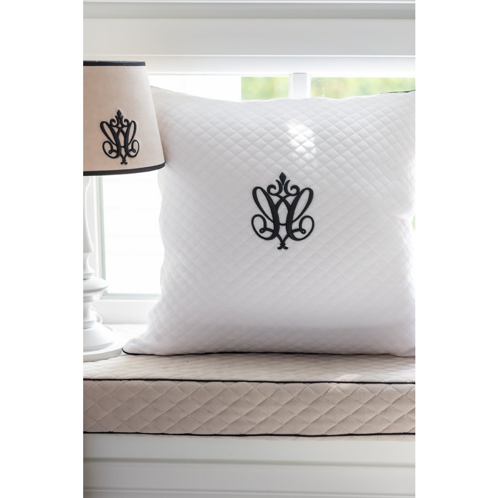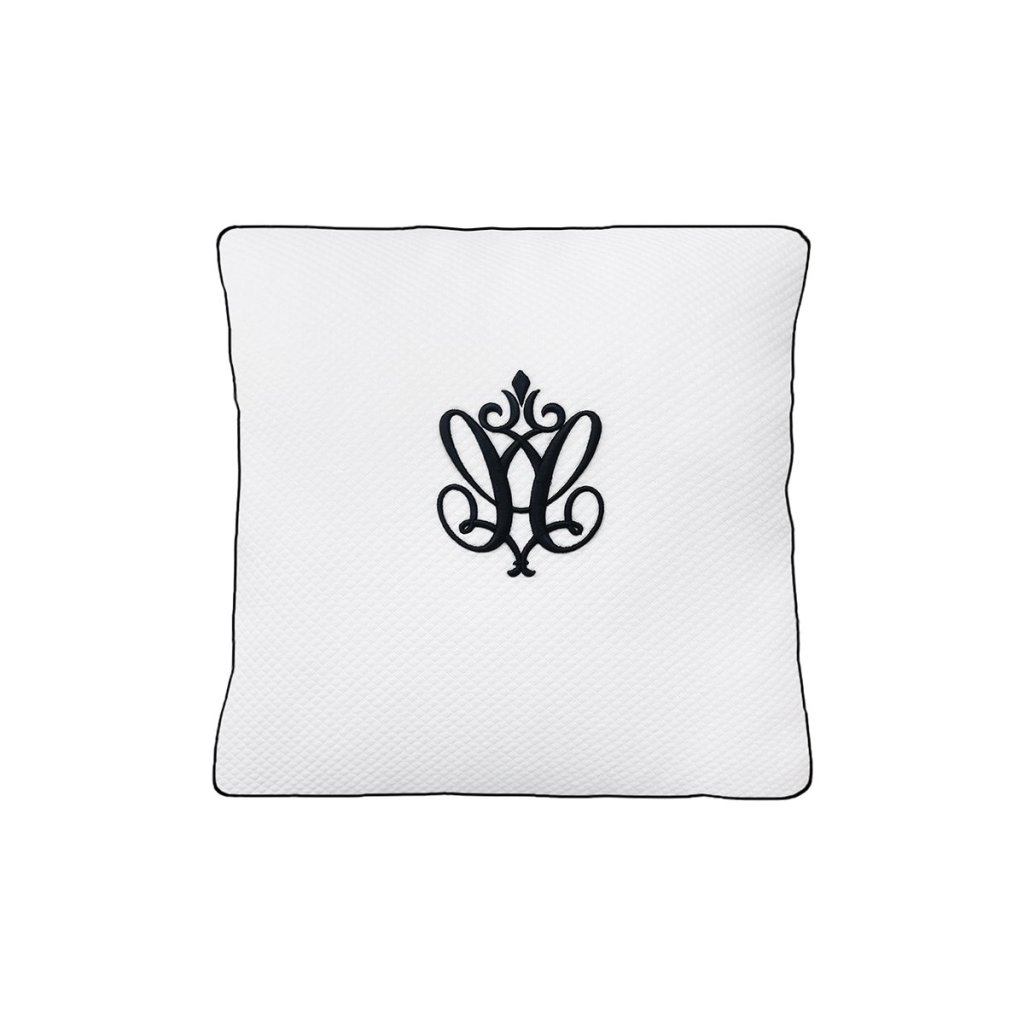 Rozkošný vankúšik z bielej vaflovej látky zdobený čiernou lemovkou a výšivkou. Súčasťou vankúšika je obliečka na vankúš s výplňou. Dostupný v dvoch veľkostiach.