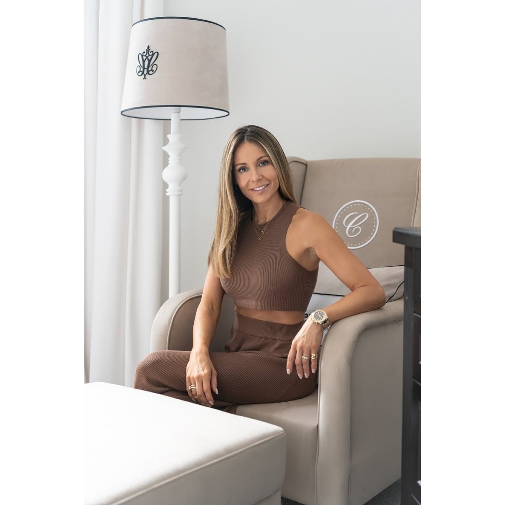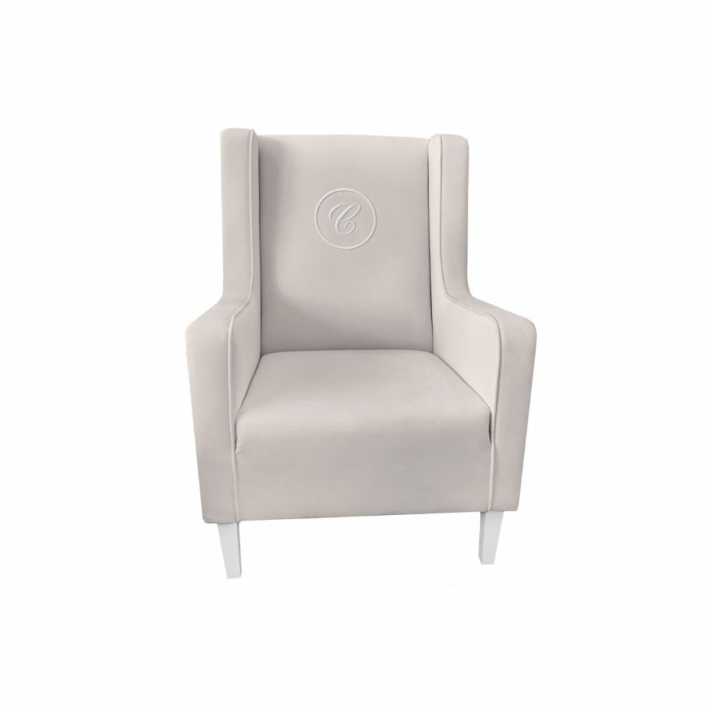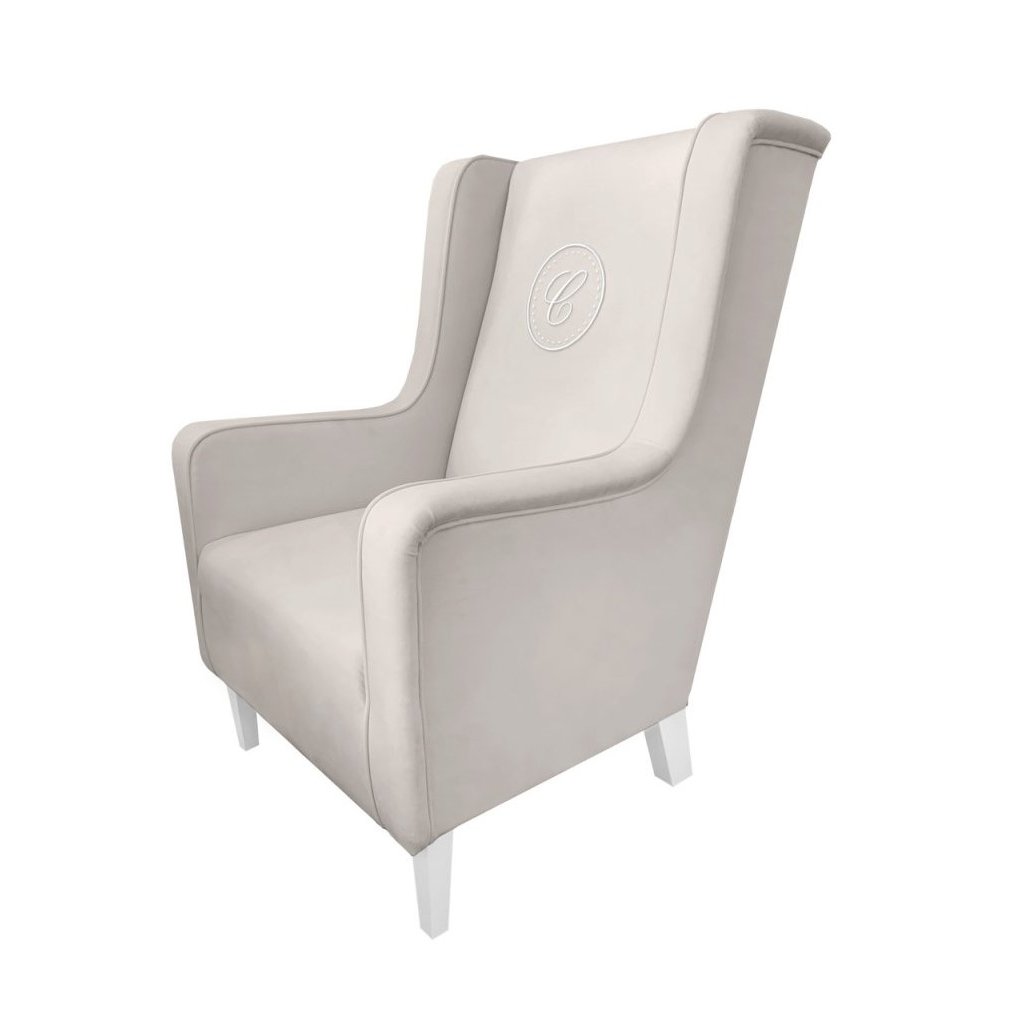 Veľké a veľmi pohodlné moderné kreslo potiahnuté kvalitným umývateľným materiálom v béžovej farbe. Kreslo je zdobené elegantnou bielou dekoráciou a exkluzívnym znakom s písmenom „C“ v bielej farbe. Toto kreslo ocení každá dojčiaca mamička vzhľadom na vysoké opierky na hlavu a lakťové opierky. Kreslo zapadá do každého interiéru - detskej izby, obývacej izby, spálne a ďalších.