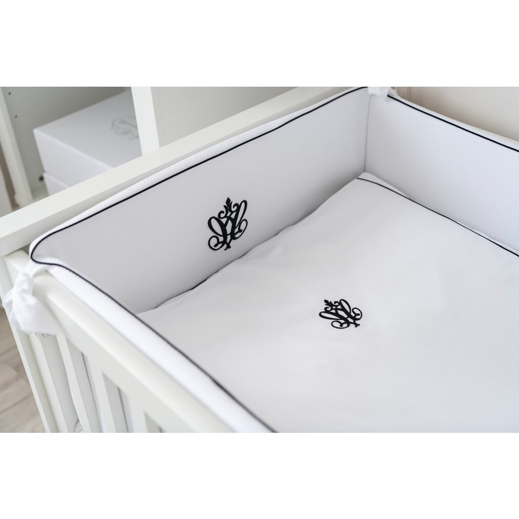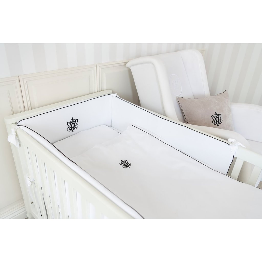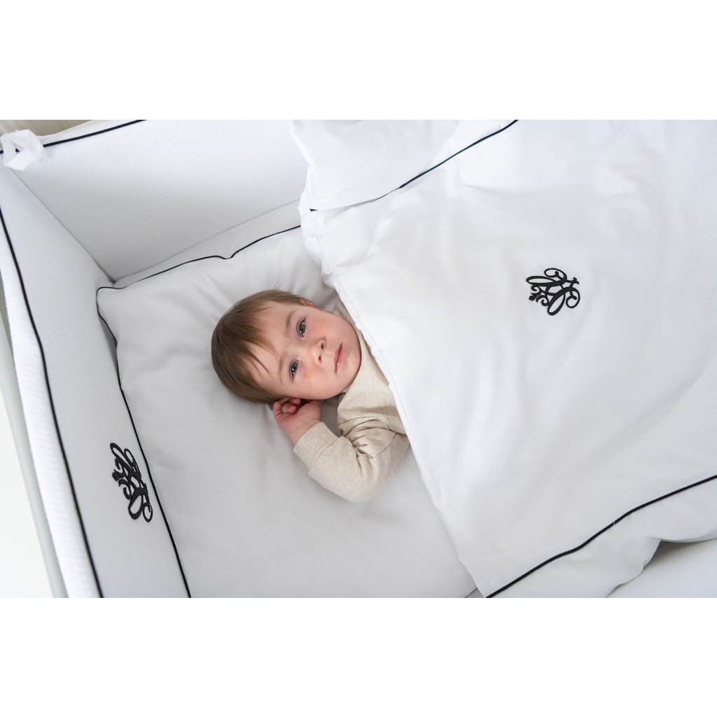 Krásne obliečky z bielej farby zdobené s čiernou lemovkou. Hladká bavlna bola kombinovaná, zdobená elegantnou trojrozmernou čiernou výšivkou a vsadkou. Verzia pre batoľa, ideálna do postieľky Dream a postieľky Modern Classic.