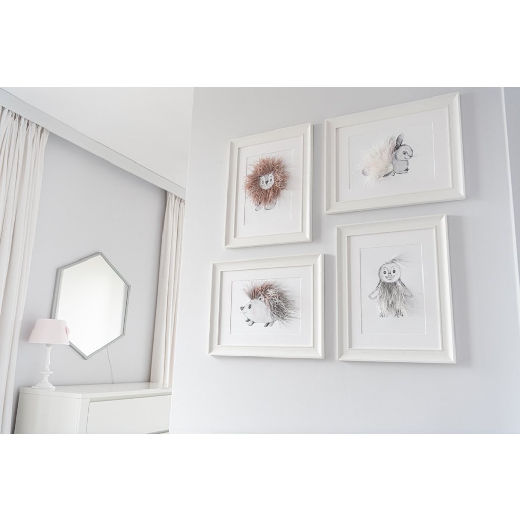 Krásny trojrozmerný textilný obrázok s motívom lev, dotvorený prírodnými pierkami. Krásna a originálna dekorácia do detskej izby. Zvýraznený dreveným bielym rámom.