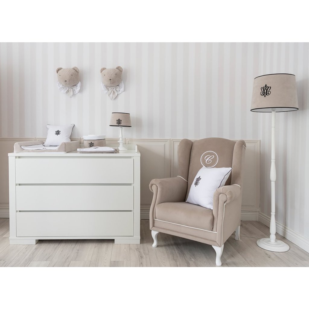 Krásny dizajn pre dievčatá. Stojacia lampa z béžového velúru. Zdobené čiernou ozdobnou páskou a výšivkou. Veľká izbová lampa. Dokonalé svetlo do každej detskej izby. Táto lampa je ručne vyrábaná a medzi ramenami a hlavným prvkom sú viditeľné spojenia. Vďaka ručnej výrobe je každá lampa jedinečným výrobkom a môže sa od seba líšiť.