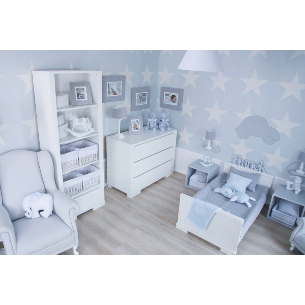 Očarujúca biela knižnica krásne zakončená ozdobným soklom a vybavená praktickou zásuvkou. Kus nábytku, ktorý je potrebný v každej detskej izbe. Priestranné police poskytujú dostatok miesta na všetky potrebné vecičky pre bábätko, hračky a iné doplnky. Odporúčame si dokúpiť praktické košíky.