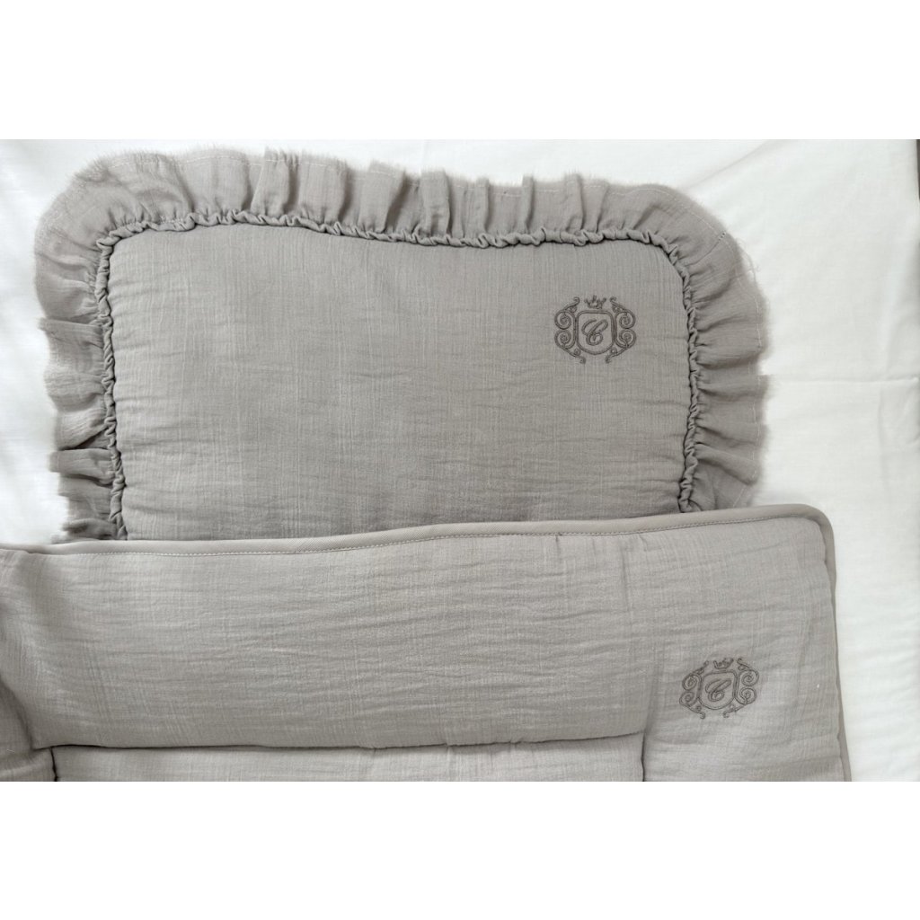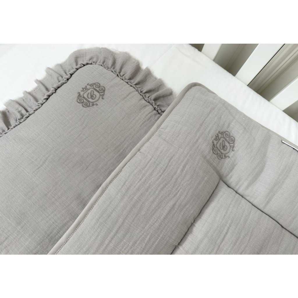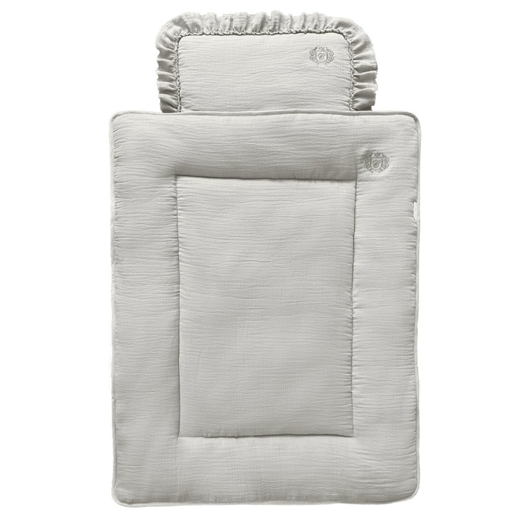 Ľahké obliečky pre malé bábätko, už s výplňou, ideálne na teplejšie dni. Je vyrobená z priedušného béžového mušelínu a zdobená firemnou výšivkou a volánkom okolo vankúša. Je menšia ako bežná posteľná bielizeň pre dojčatá, hodí sa do postieľky či kočíka.