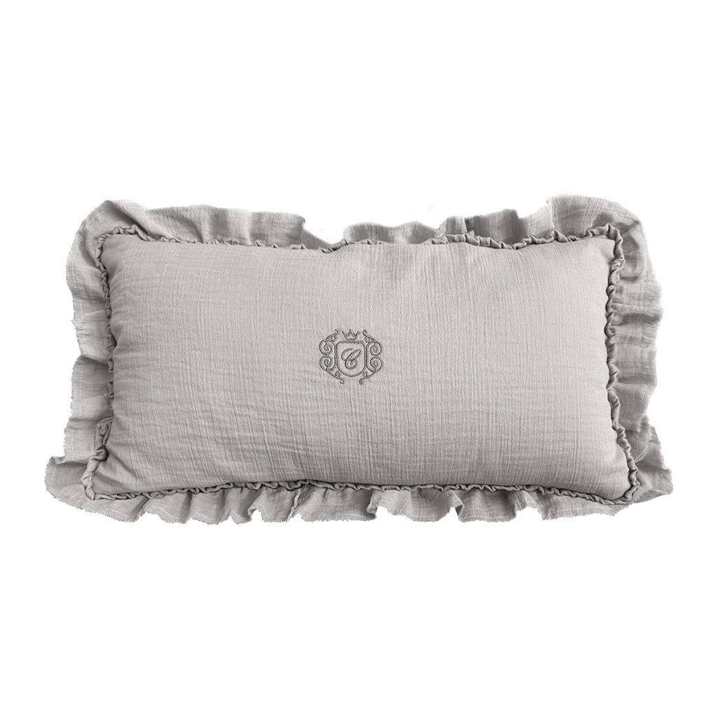 Krásny mušelínový vankúš v odtieni svetlej béžovej, zdobený očarujúcim volánom a elegantnou výšivkou. Zapína sa vzadu na zips.