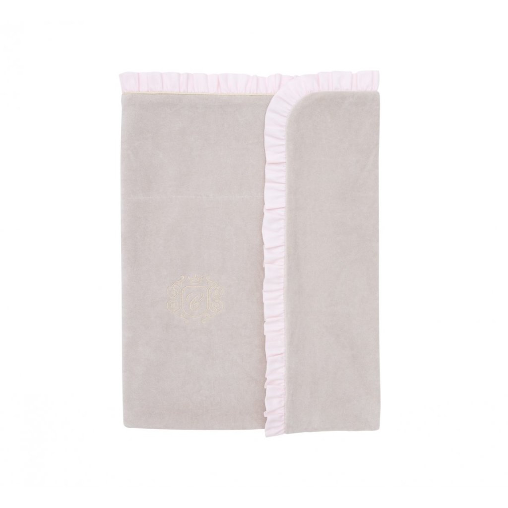 Elegantná deka pieskovej béžovej farby z jemného velúru. Zdobené zlatým znakom a ružovým volánom. Ideálna ako darček - je zabalená v elegantnej krabičke.