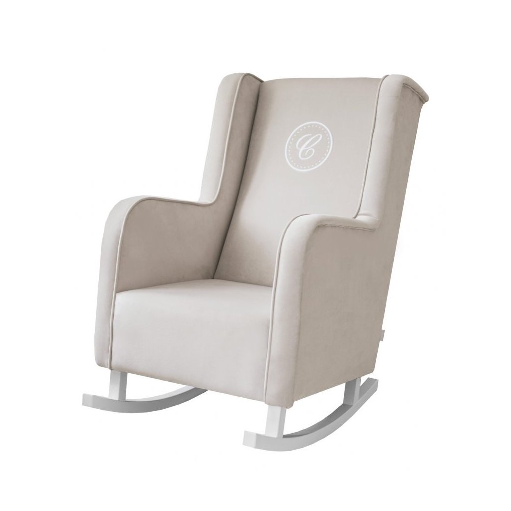 Veľké a veľmi pohodlné hojdacie moderné kreslo potiahnuté kvalitným umývateľným materiálom v béžovej farbe. Kreslo je zdobené elegantnou bielou dekoráciou a exkluzívnym znakom s písmenom „C“ v bielej farbe. Toto hojdacie kreslo ocení každá dojčiaca mamička vzhľadom na vysoké opierky na hlavu a lakťové opierky. Kreslo zapadá do každého interiéru - detskej izby, obývacej izby, spálne a ďalších.