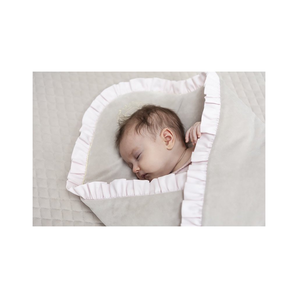 Elegantná zavinovačka z béžového velúru s očarujúcimi volánikmi. Je vyplnený rúnom, vďaka čomu je veľmi pekná a hrejivá. Po rozložení bude perfektná aj ako letná prikrývka.
