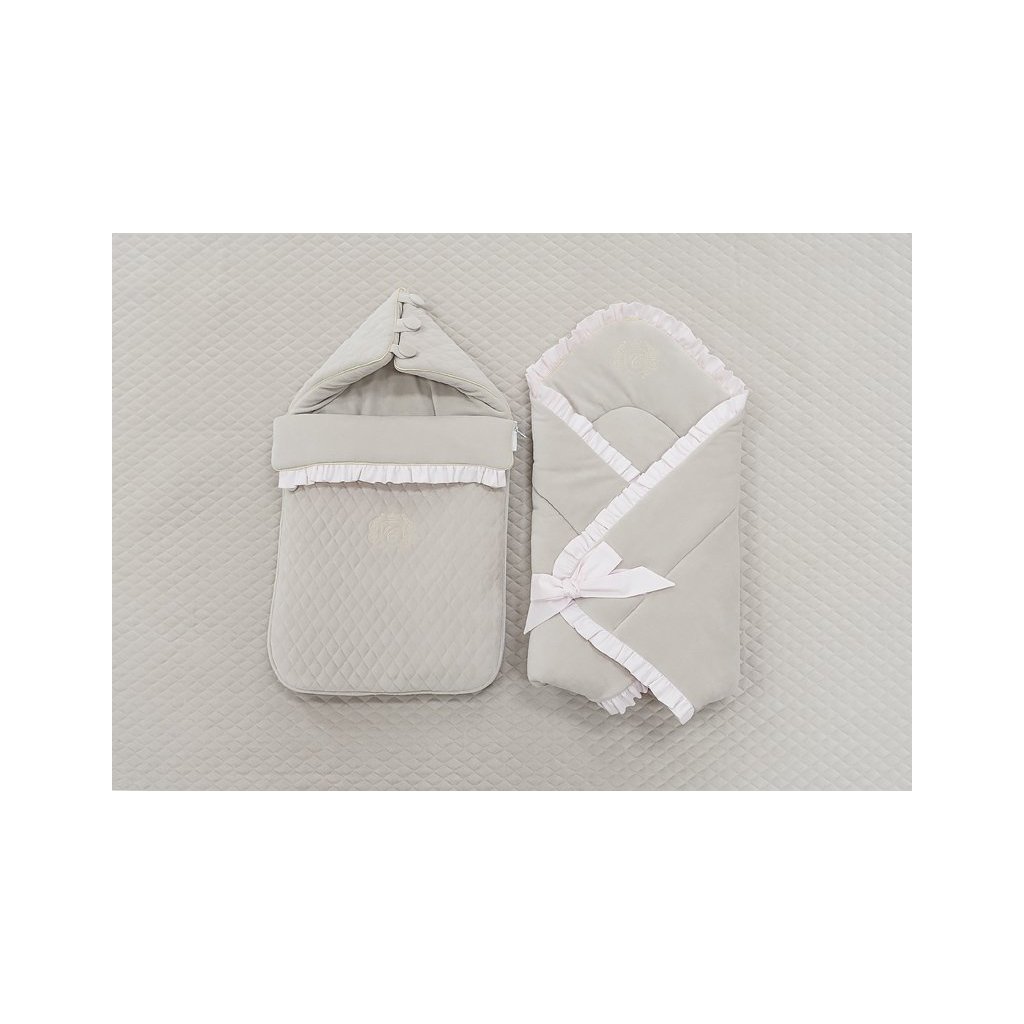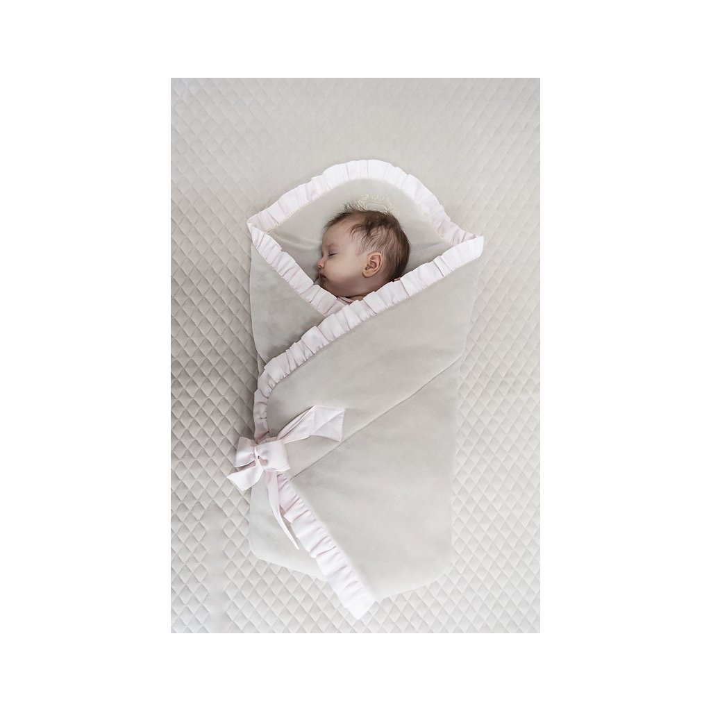 Elegantná zavinovačka v béžovej farbe. Je vyrobená z béžového velúru a vyplnený rúnom, vďaka čomu je veľmi pekná a hrejivá. Zdobené zlatou výšivkou a očarujúcimi volánikmi. Používanie je veľmi pohodlné - viazanie na mašľu. Nemá žiadne výstužné prvky a po rozložení bude perfektná aj ako letná prikrývka.