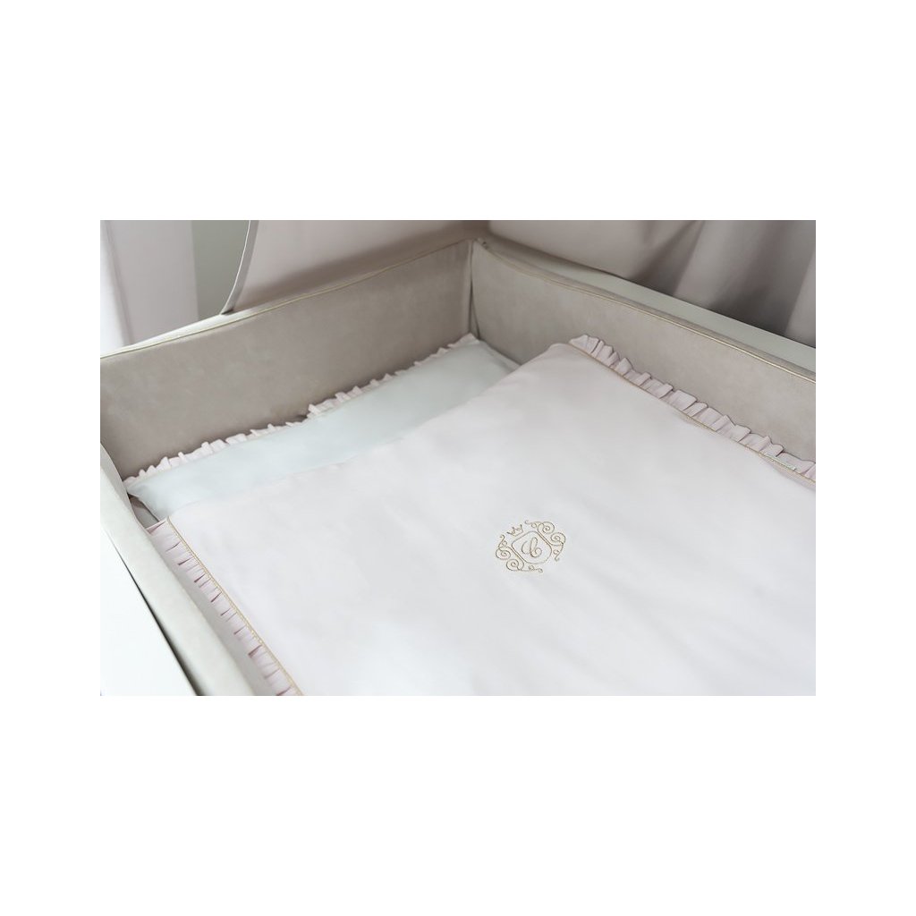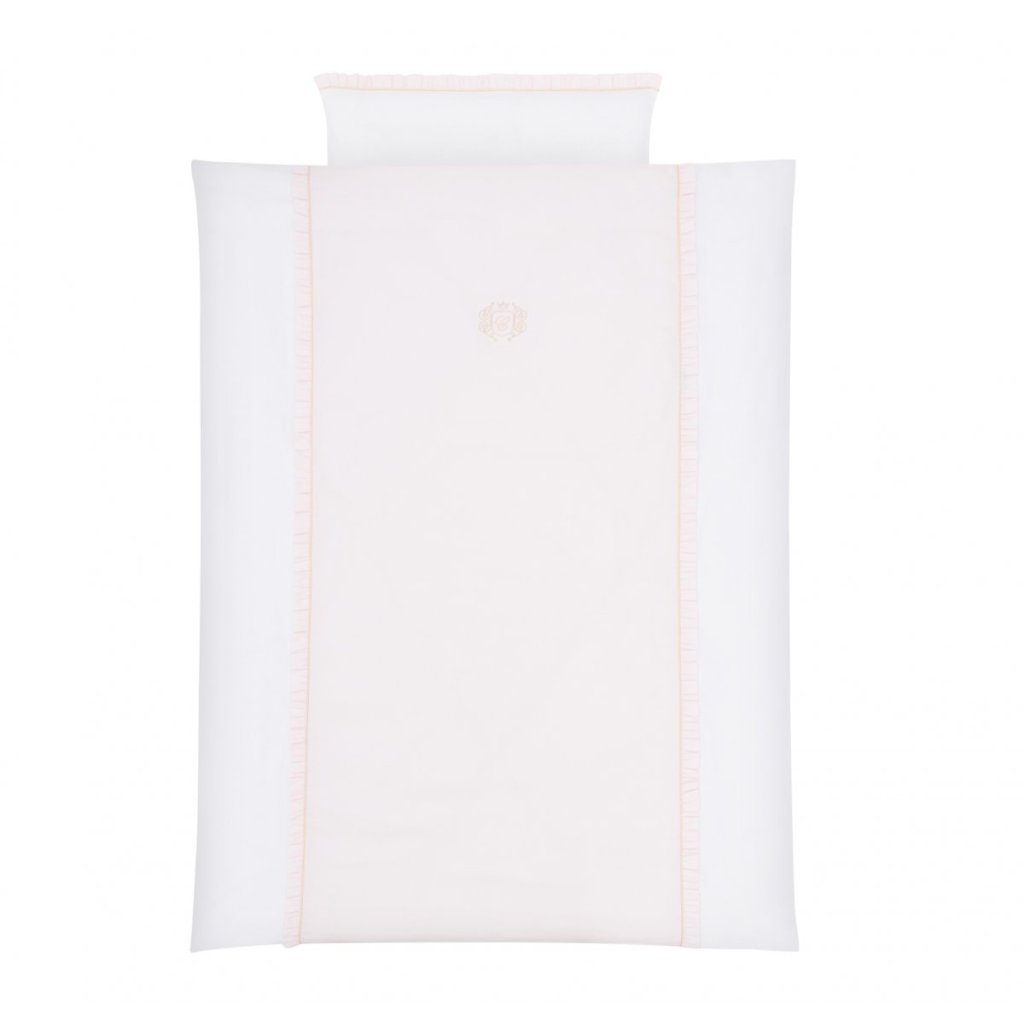 Krásne posteľné prádlo vyrobené z bielej a ružovej saténovej bavlny. Je ozdobený elegantným zlatým znakom a rozkošným volánom.