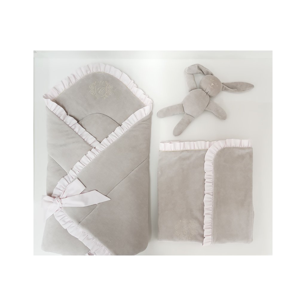 Elegantná hrejivá zimná deka pieskovej béžovej farby z jemného velúru a plyšového textilu. Zdobené zlatým znakom a ružovým volánom. Ideálna ako darček - je zabalená v elegantnej krabičke.