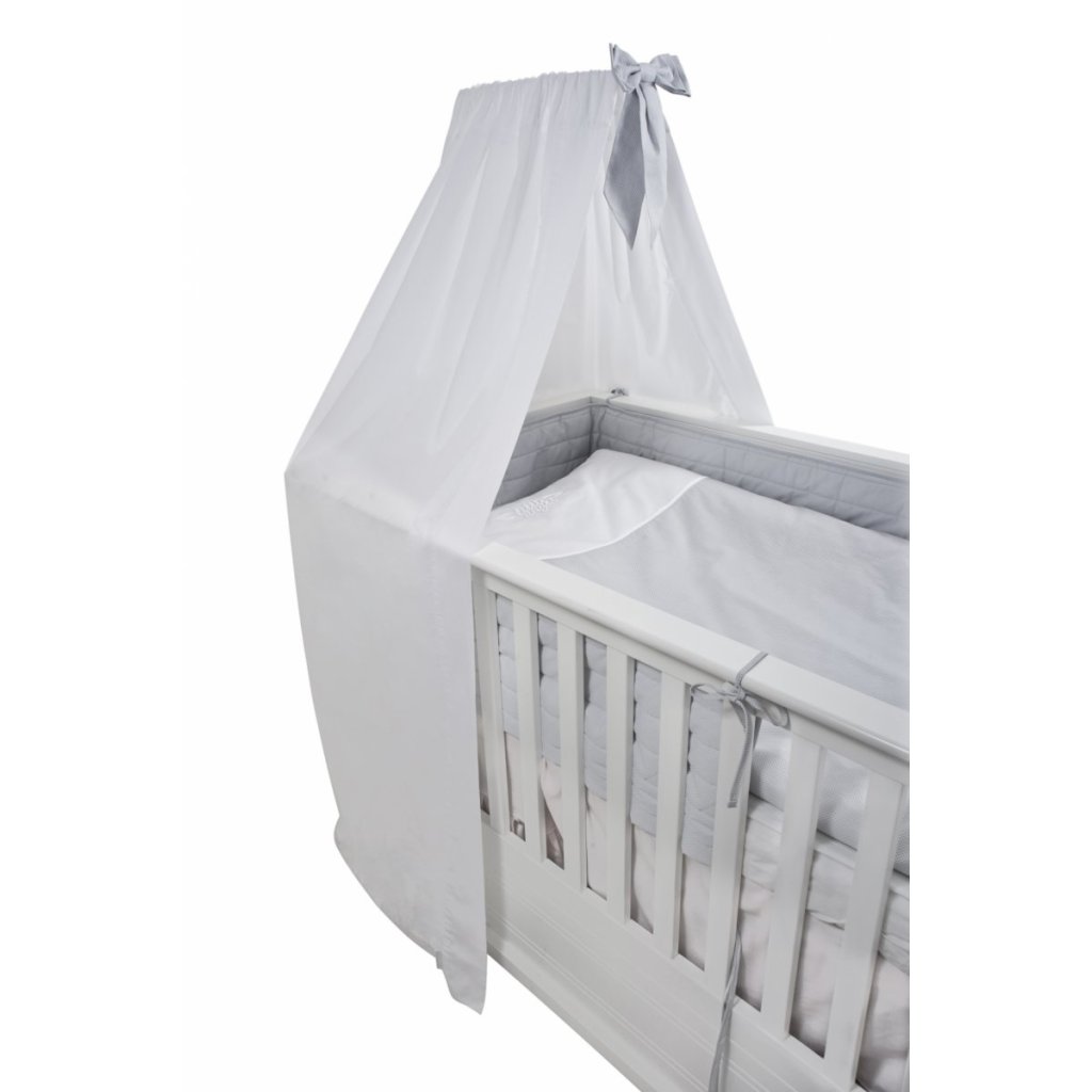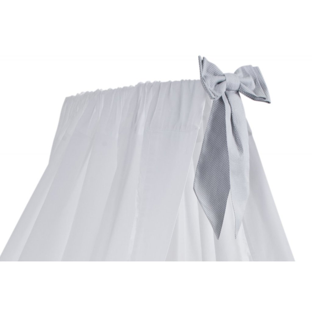 Krásny stojaci baldachýn do detskej izby. Vyrobené z bielej saténovej bavlny a zdobené sivou mašľou v kockách. Baldachýn je elegantný doplnok, ktorý zútulní detskú postieľku a bábätko sa bude cítiť bezpečnejšie.