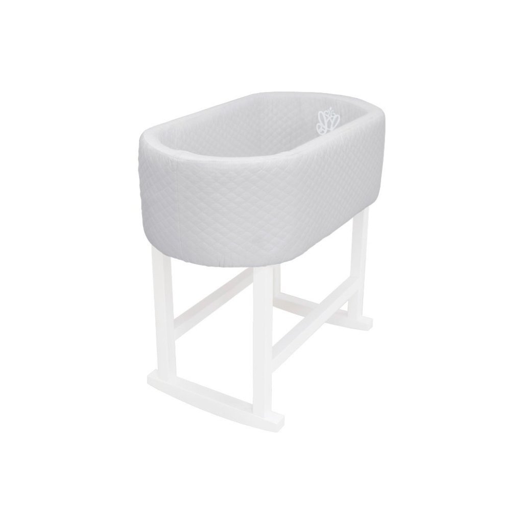 Elegantná kolíska čalúnená prešívaným velúrom v šedej farbe a zdobená trojrozmernou výšivkou. Tento útulný kus nábytku poskytuje dieťaťu jemné hojdanie, a tým aj pokojný spánok.