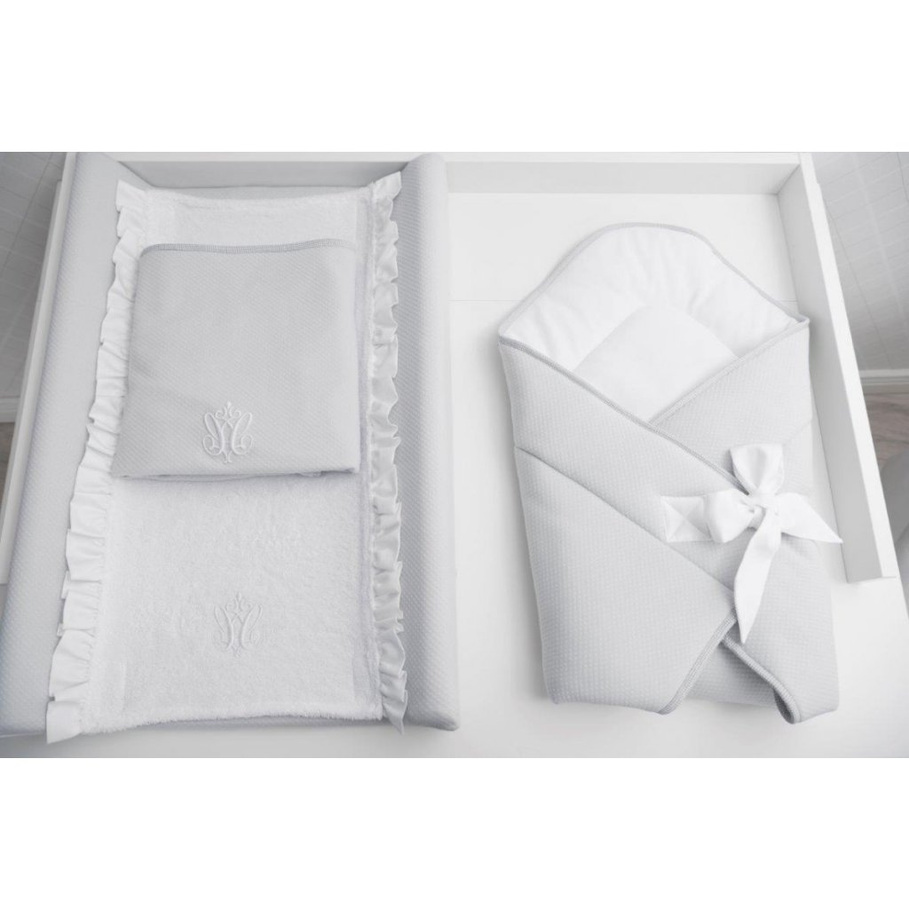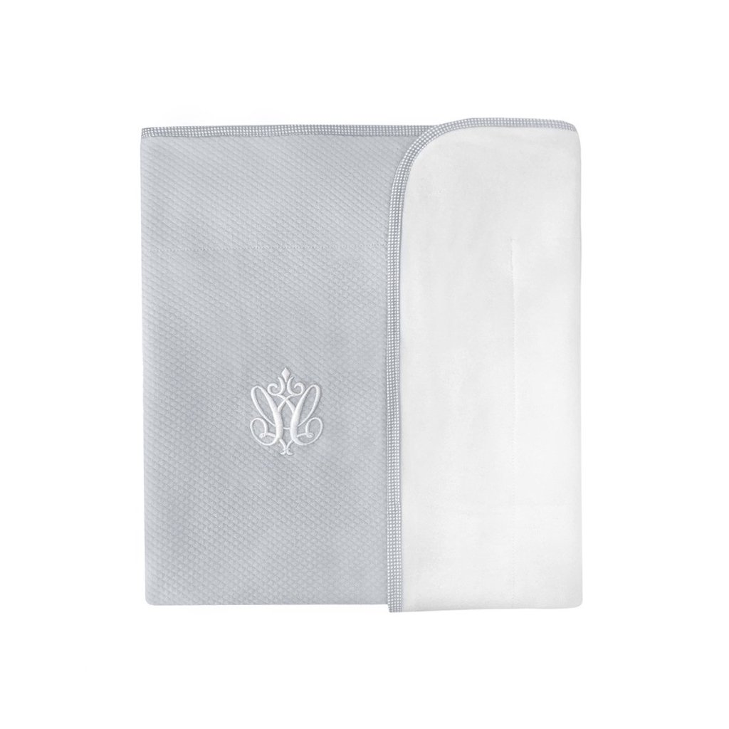 Elegantná deka vo svetlosivej farbe zdobená štýlovým znakom. Vrchná strana zo svetlosivej bavlny, spodná z bieleho velúru. Deka bude skvelým doplnkom výbavičky z kolekcie Pure Grey a dobrým nápadom na darček pre dieťa. Balené v elegantnej krabičke.