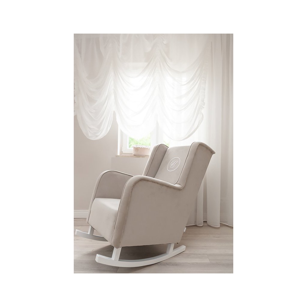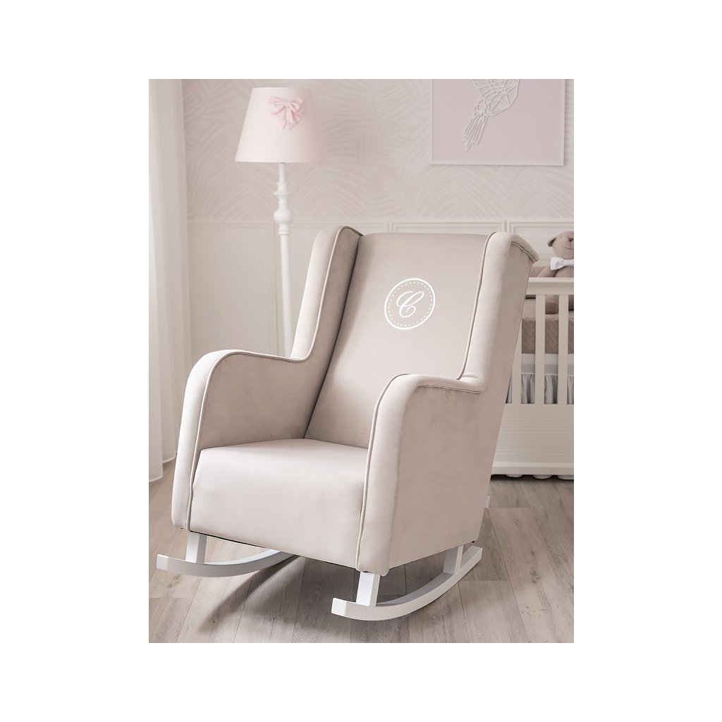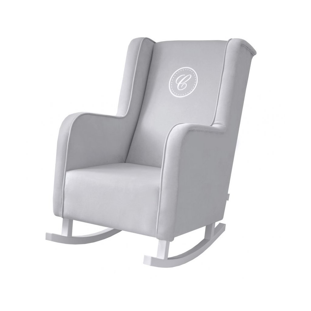 Veľké a veľmi pohodlné hojdacie moderné kreslo potiahnuté kvalitným umývateľným materiálom v šedej farbe. Kreslo je zdobené elegantnou bielou dekoráciou a exkluzívnym znakom s písmenom „C“ v bielej farbe. Toto hojdacie kreslo ocení každá dojčiaca mamička vzhľadom na vysoké opierky na hlavu a lakťové opierky. Kreslo zapadá do každého interiéru - detskej izby, obývacej izby, spálne a ďalších.