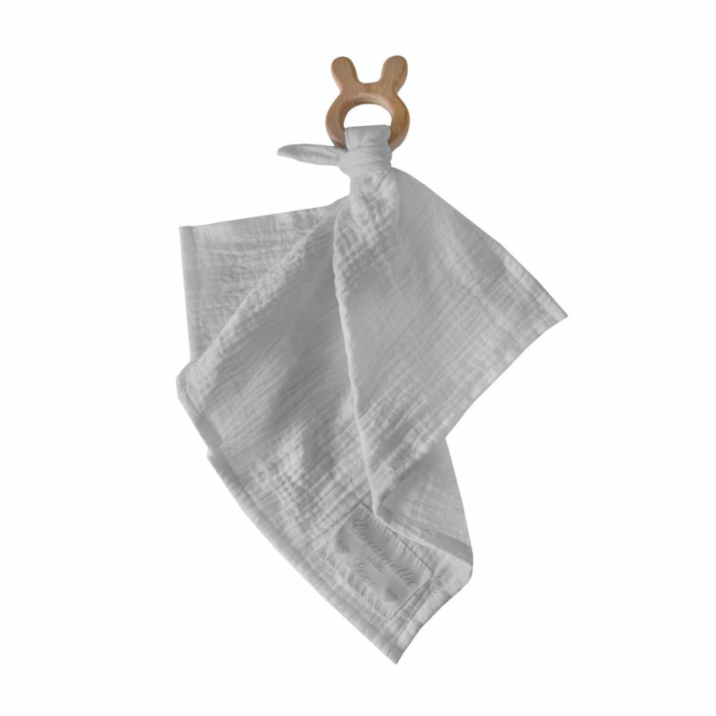 Drevené hryzátko s mušelínovou plienkou. Funguje ako hryzátko alebo plyšová hračka. Bezpečné pre deti.