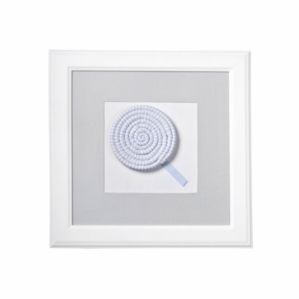 Rozkošné trojrozmerné lízatko v modrej farbe. Vnútorná časť obrazu je vyrobená z textilu. Pasparta je vyrobená zo sivej kockovej textílie.