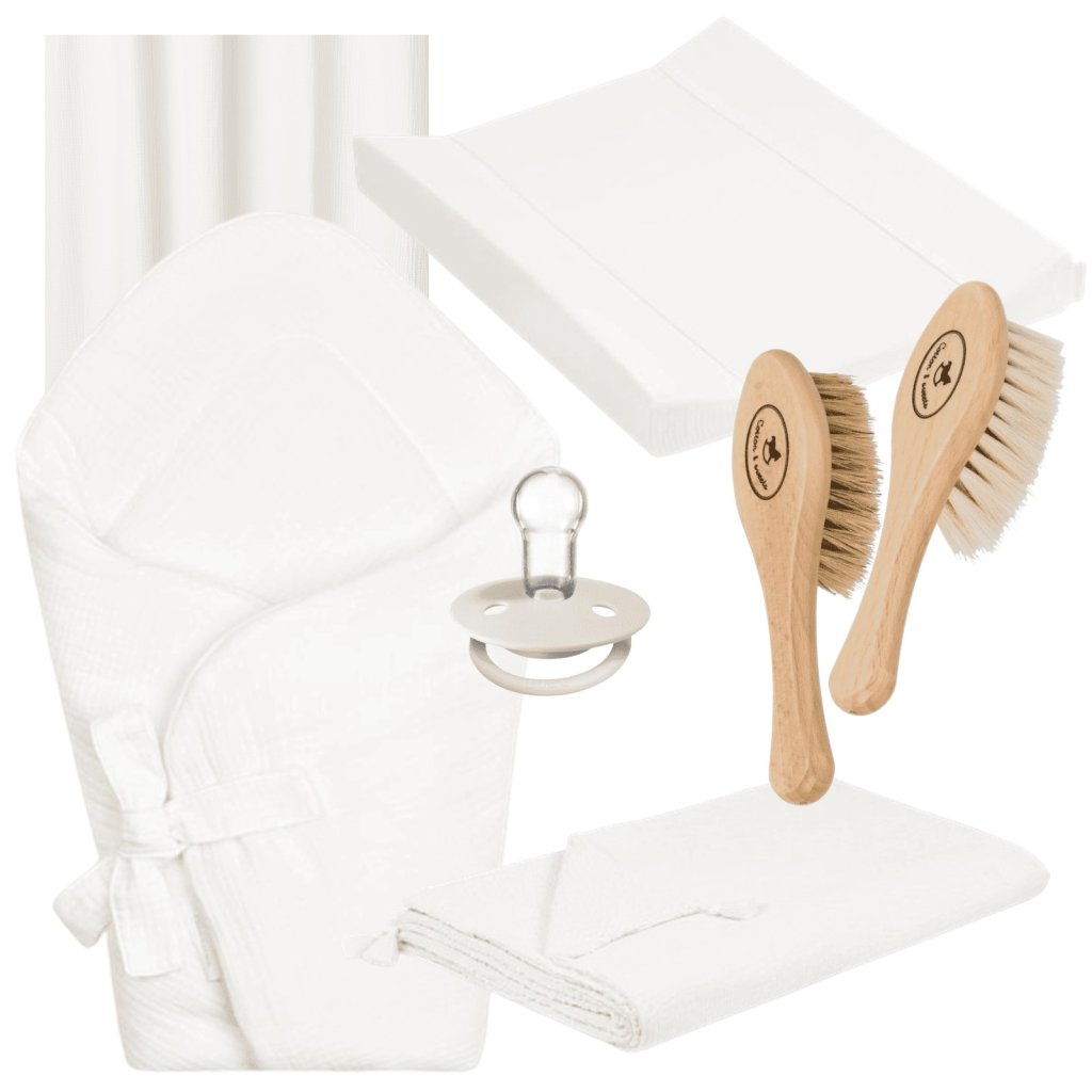 SADA obsahuje: zavinovačku, osušku, mušelínovú plienku, cumlík, relaxačnú kefu, vyčesávaciu kefu.