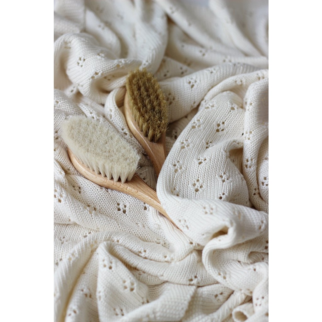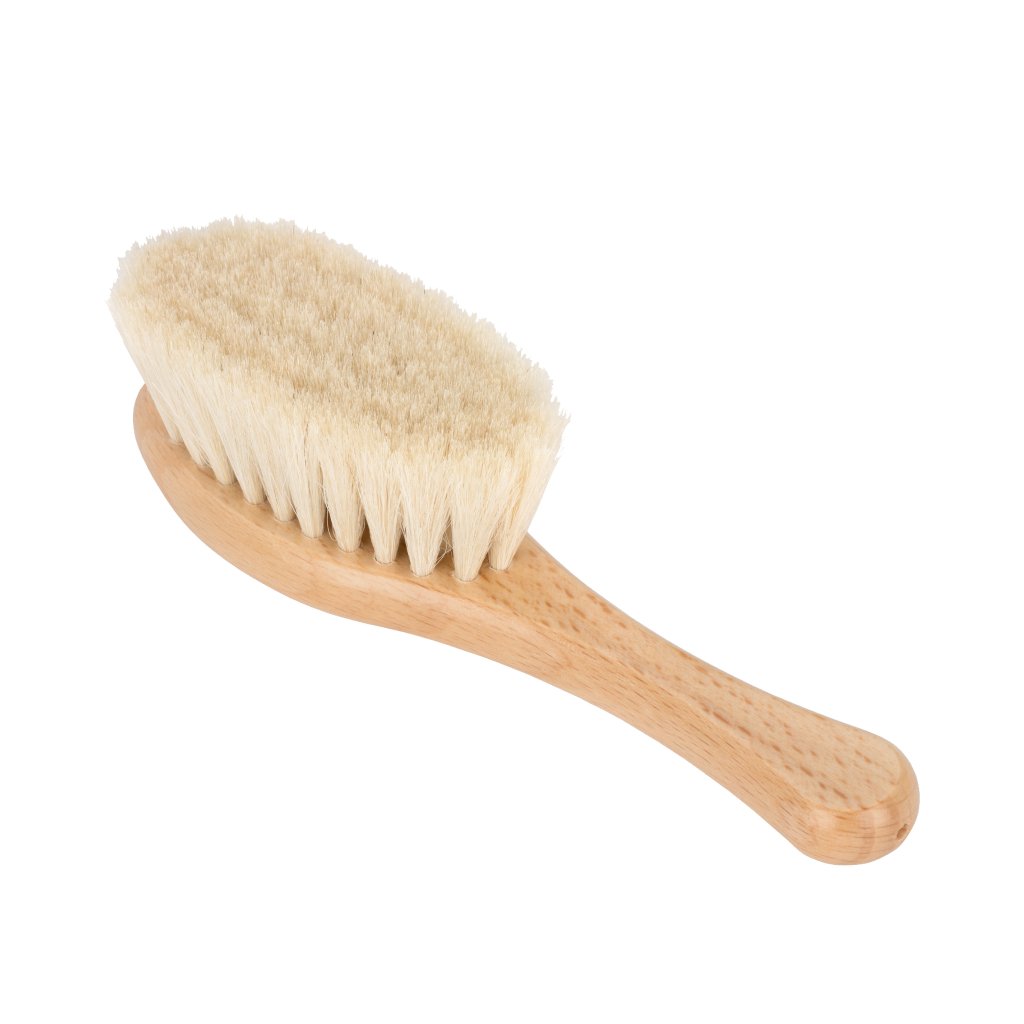 Relaxačná veľmi jemná a mäkká kefka na vlásky pre deti a dojčatá z prírodných kozích vlasov s drevenou rukoväťou, uvoľňuje a upokojuje dieťa.