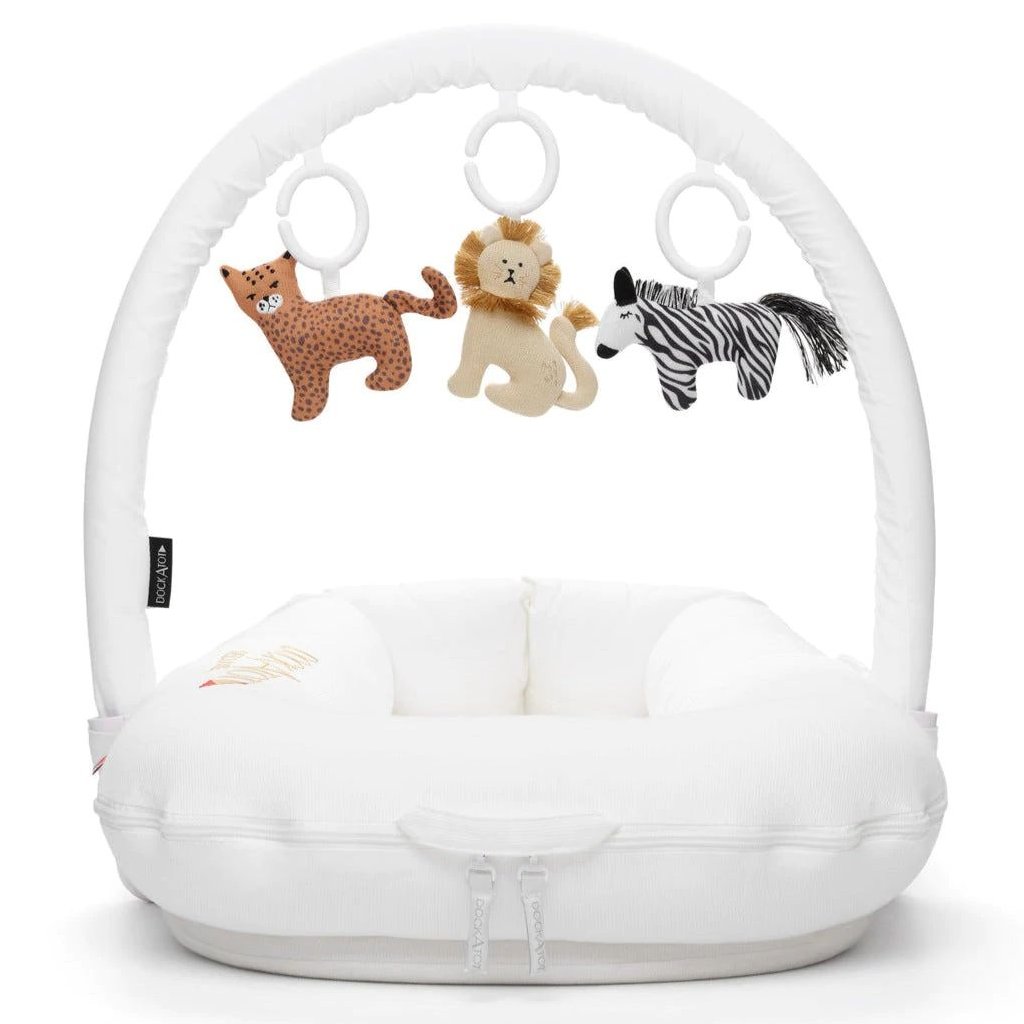 Sada hračiek Zoo je kompatibilná s Hracou hrazdou DockATot®. Tri obľúbené zvieratká pri hre podporujú zmyslový rozvoj a stimuláciu dieťatka.