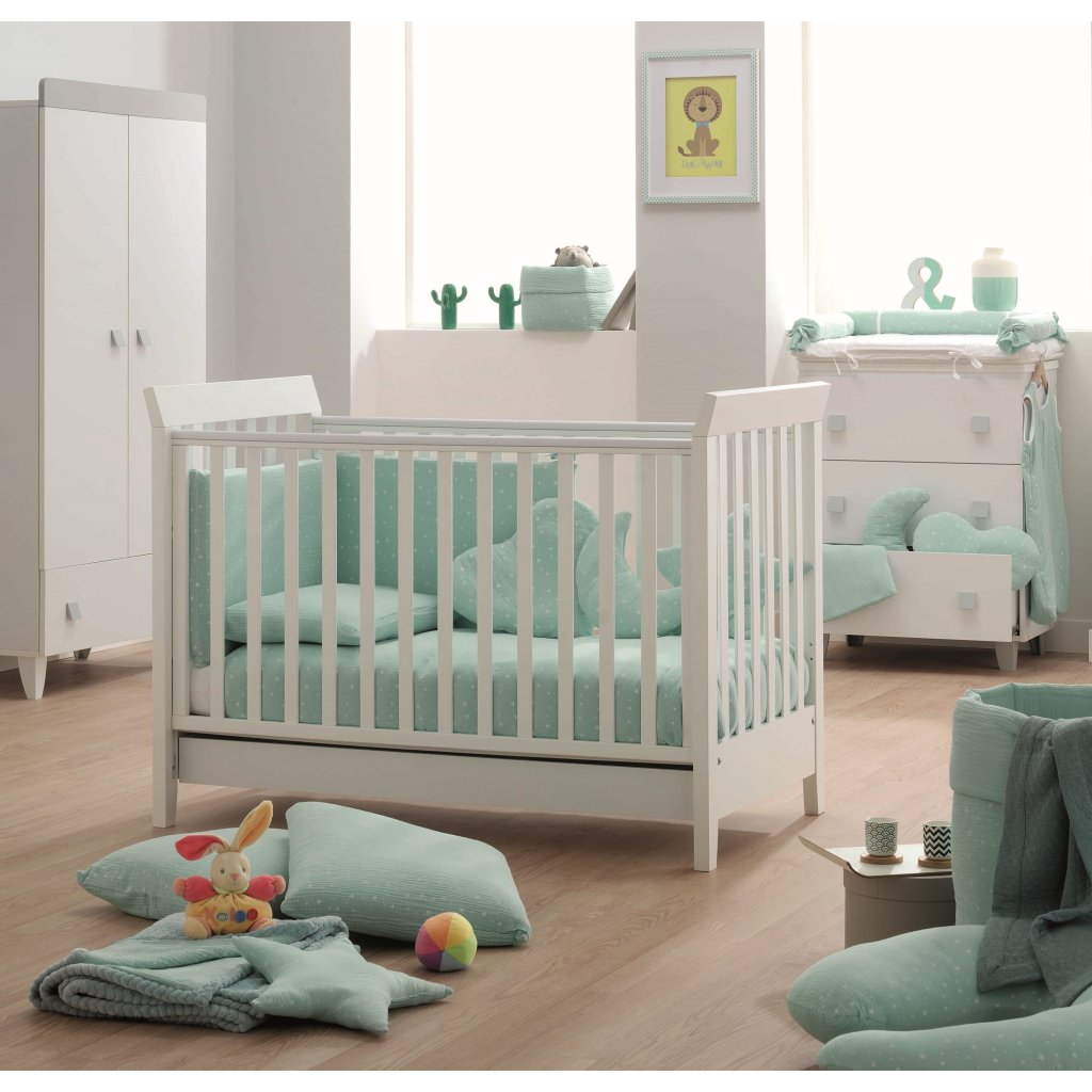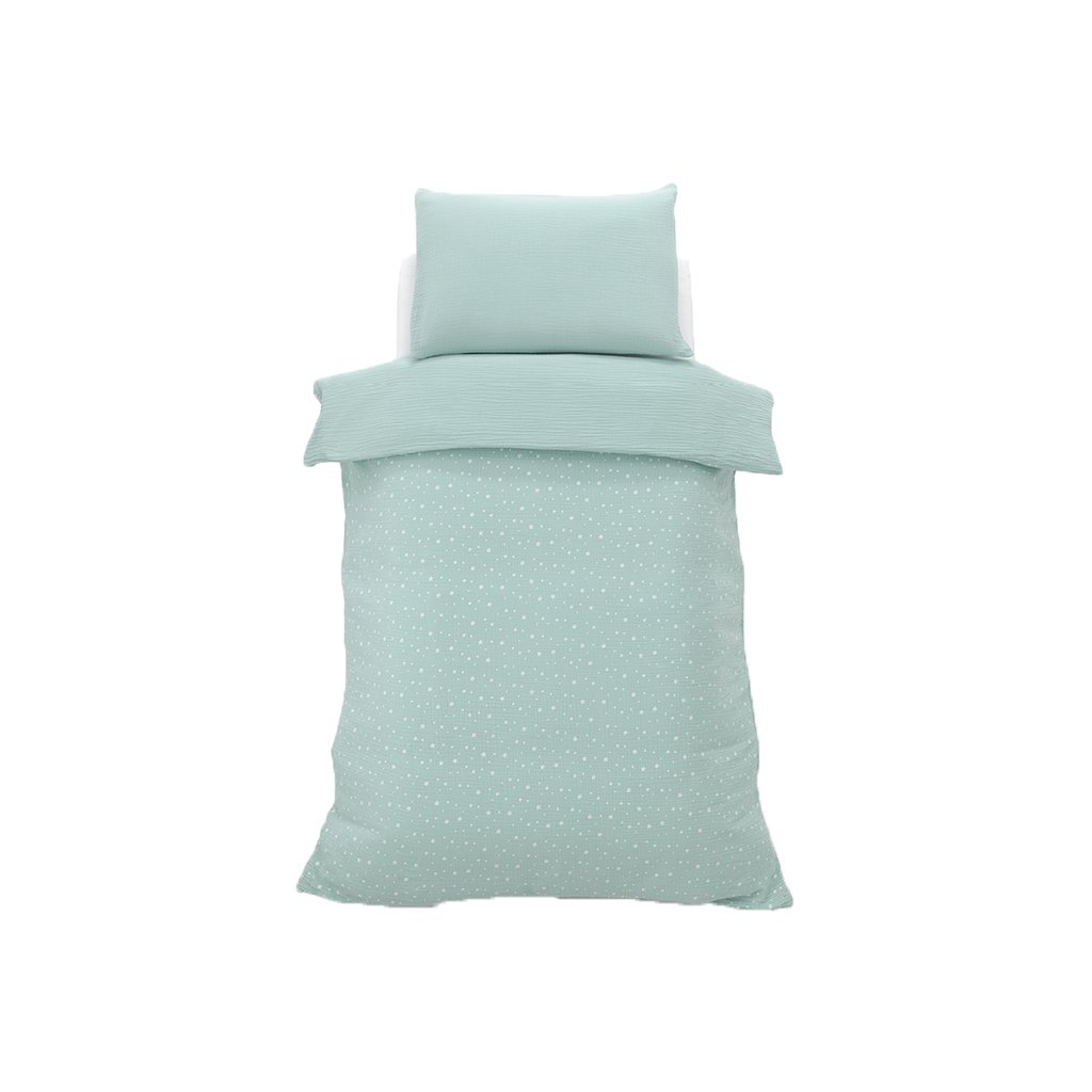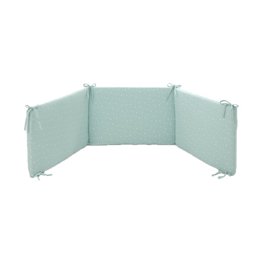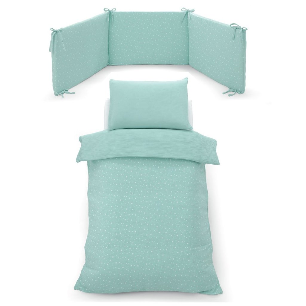 Kompletný set do postieľky z veľmi príjemnej mušelínovej bavlny s hviezdičkami. 4 dielny set obsahuje: mantinel, paplónik, návliečku na paplónik a vankúšik. Vyrobené v Taliansku.