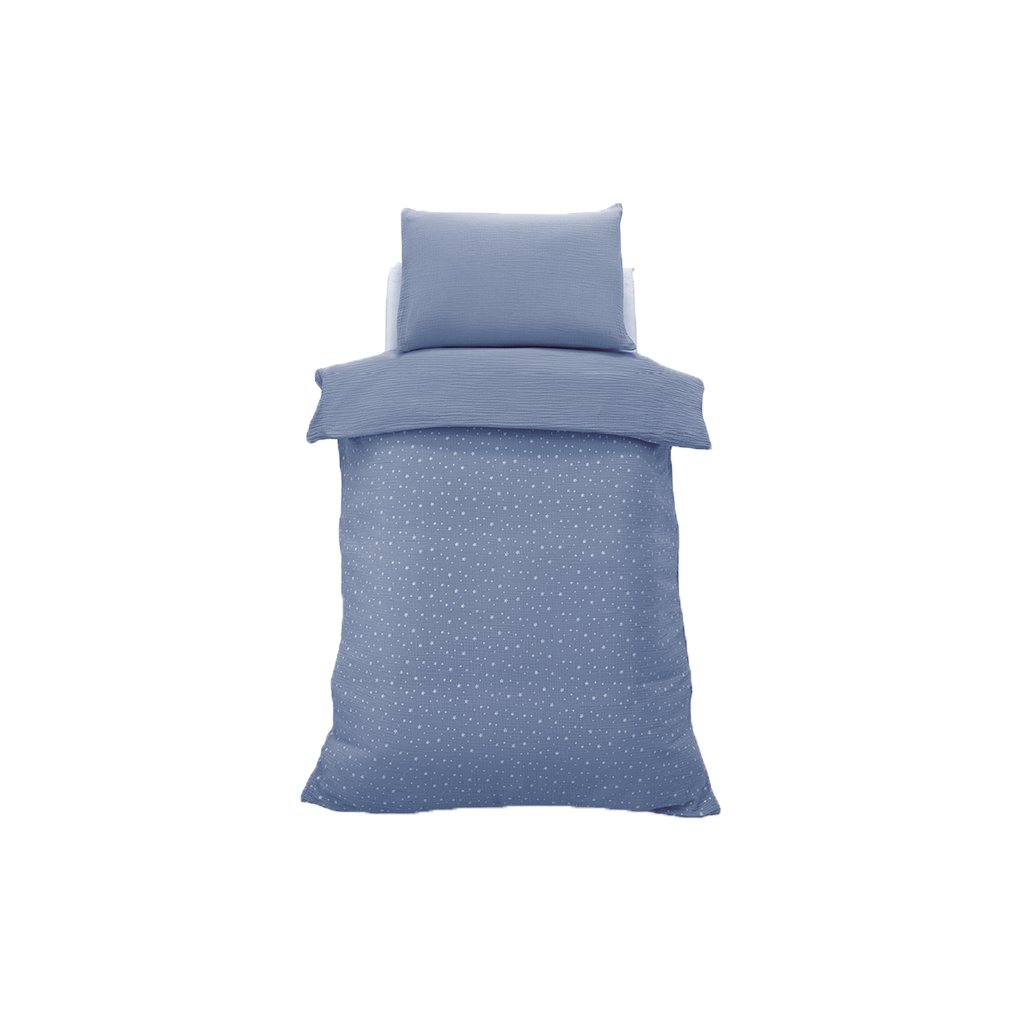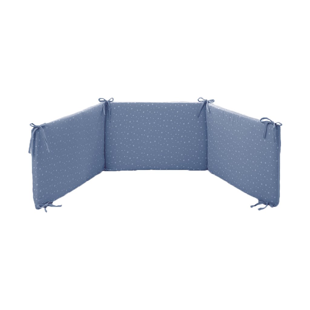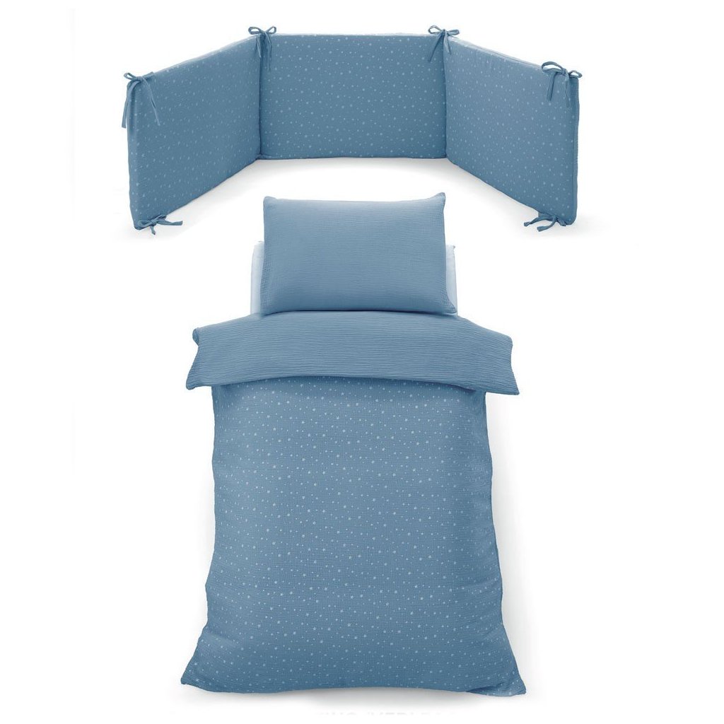 Kompletný set do postieľky z veľmi príjemnej mušelínovej bavlny s hviezdičkami. 4 dielny set obsahuje: mantinel, paplónik, návliečku na paplónik a vankúšik. Vyrobené v Taliansku.