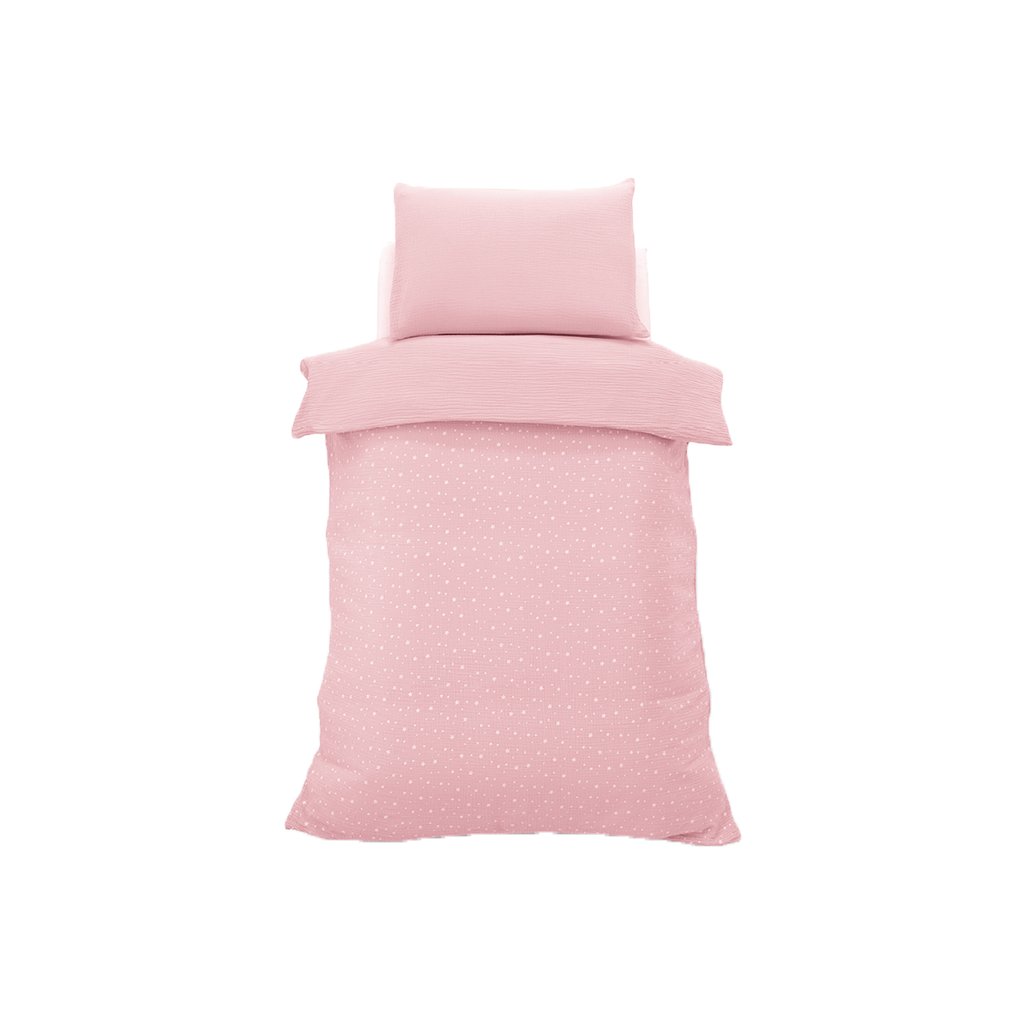 Kompletný set do postieľky z veľmi príjemnej mušelínovej bavlny s hviezdičkami. 4 dielny set obsahuje: mantinel, paplónik, návliečku na paplónik a vankúšik. Vyrobené v Taliansku.