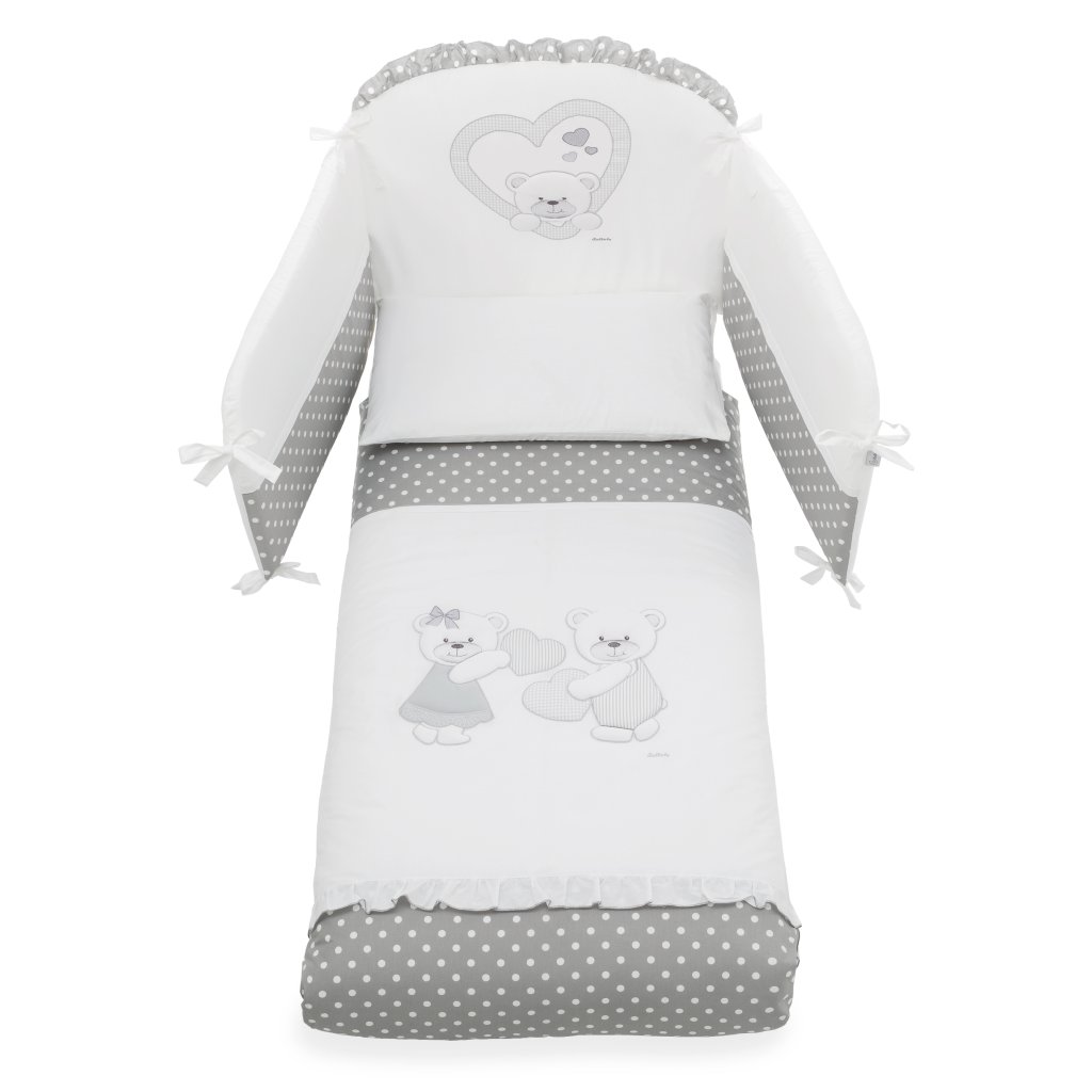Kompletný 5 dielny set obsahuje: mantinel, paplónik + návliečku, návliečku na vankúšik a bavlnenú bielu plachtu na matrac. Textilné sety do postieľky od talianského výrobcu Italbaby sú vysoko kvalitné z veľmi príjemného materiálu zamerané na precízne spracovanie každého detailu. Produkty značky Italbaby sú bezpečné, certifikované a vyrábajú sa podľa bezpečnostných noriem priamo v Taliansku.